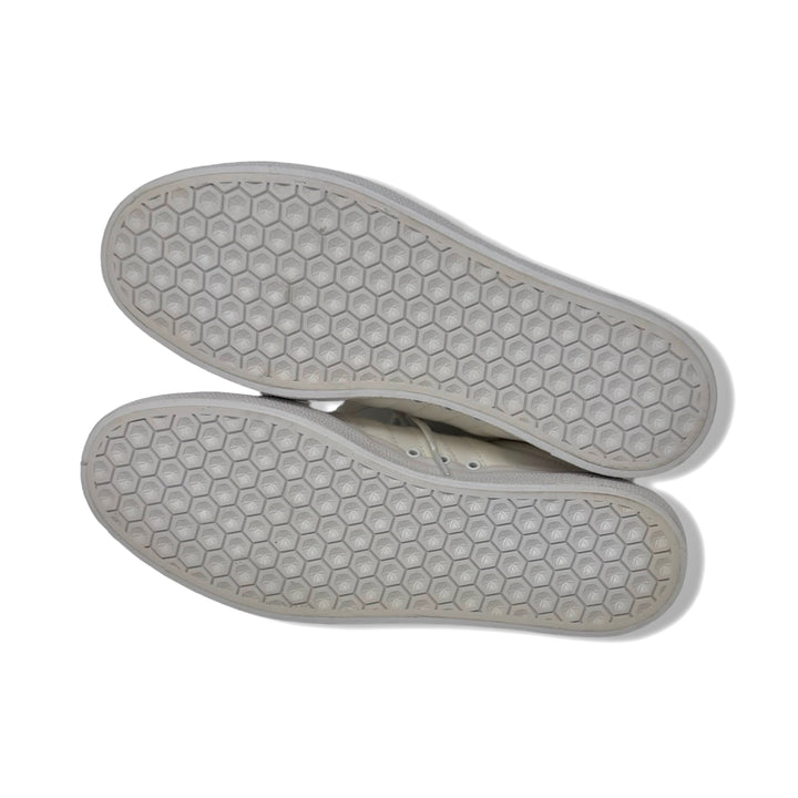 - Lace up canvas sneakers with round toe, and logo stripes on sides and back panel. Some signs of wear.