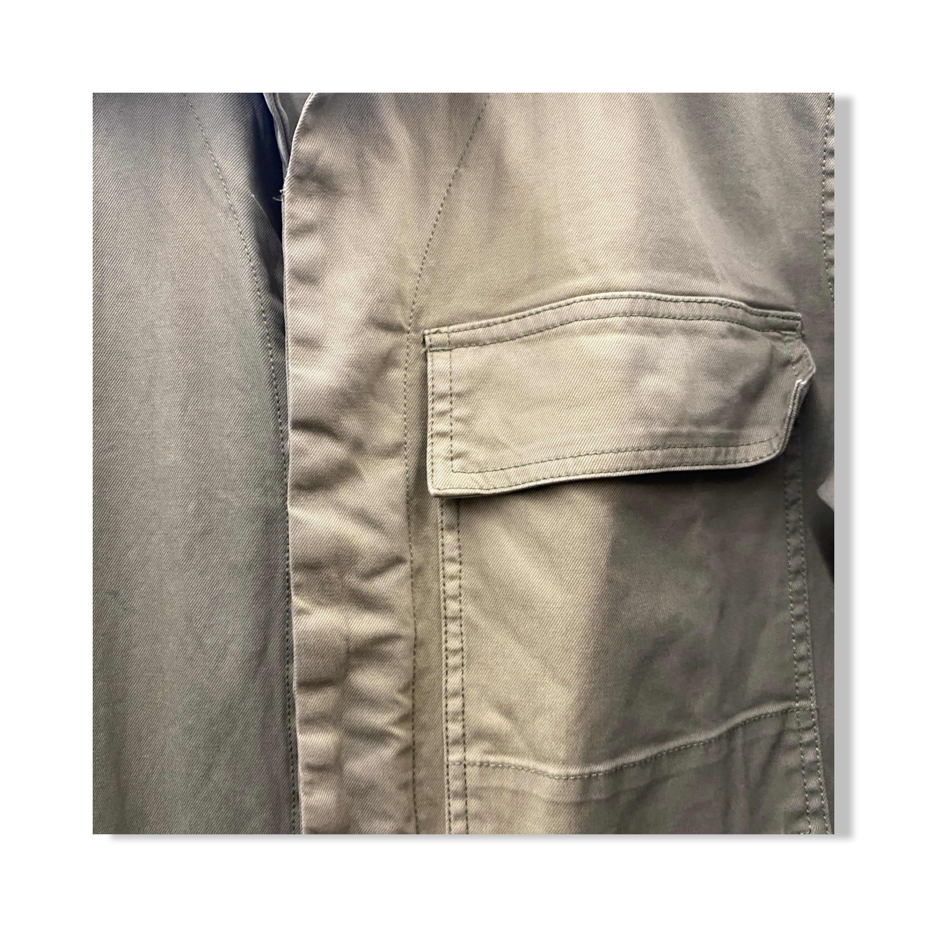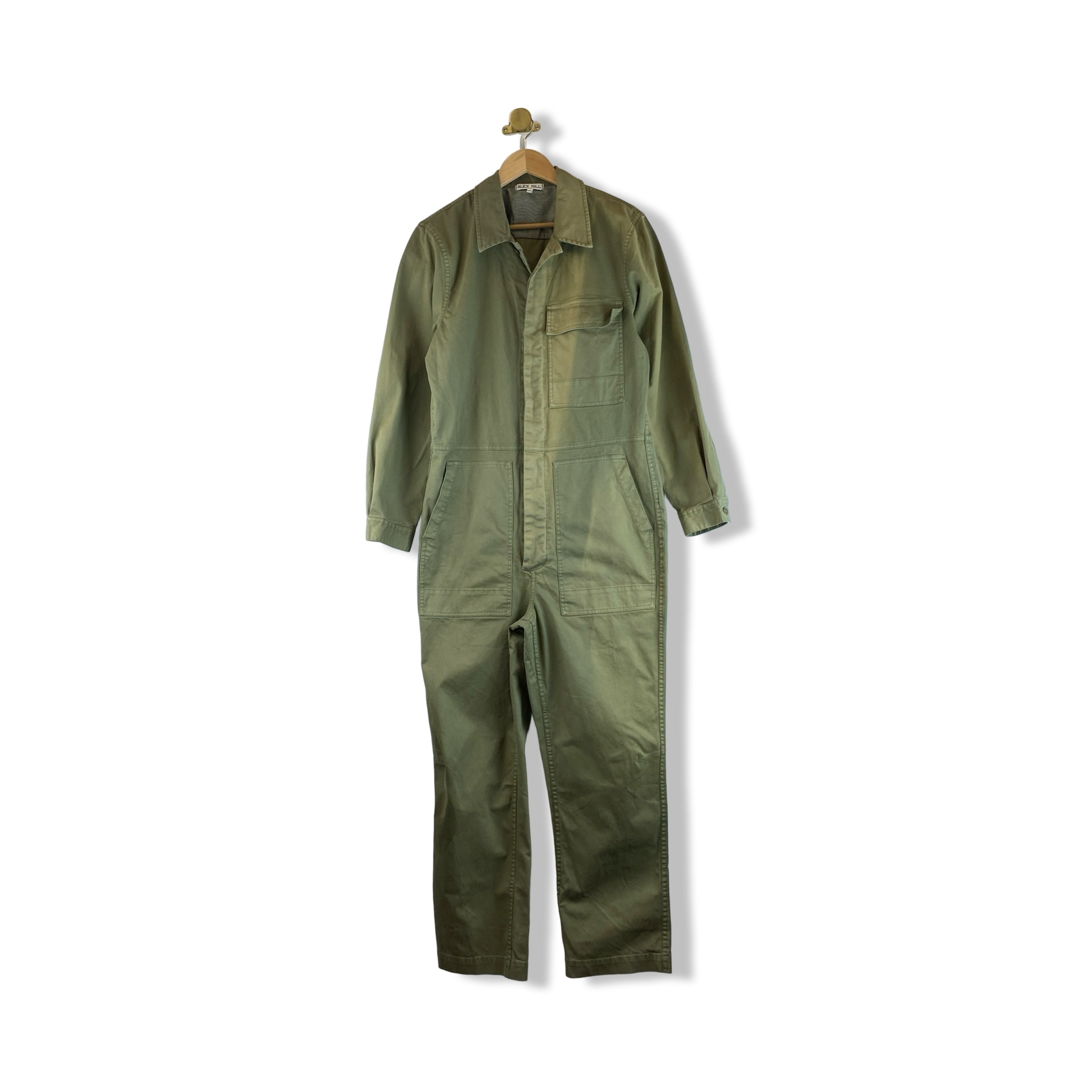 - Long sleeve jumpsuit with front and back pockets and button up closure. Discoloration on front (pictured)
