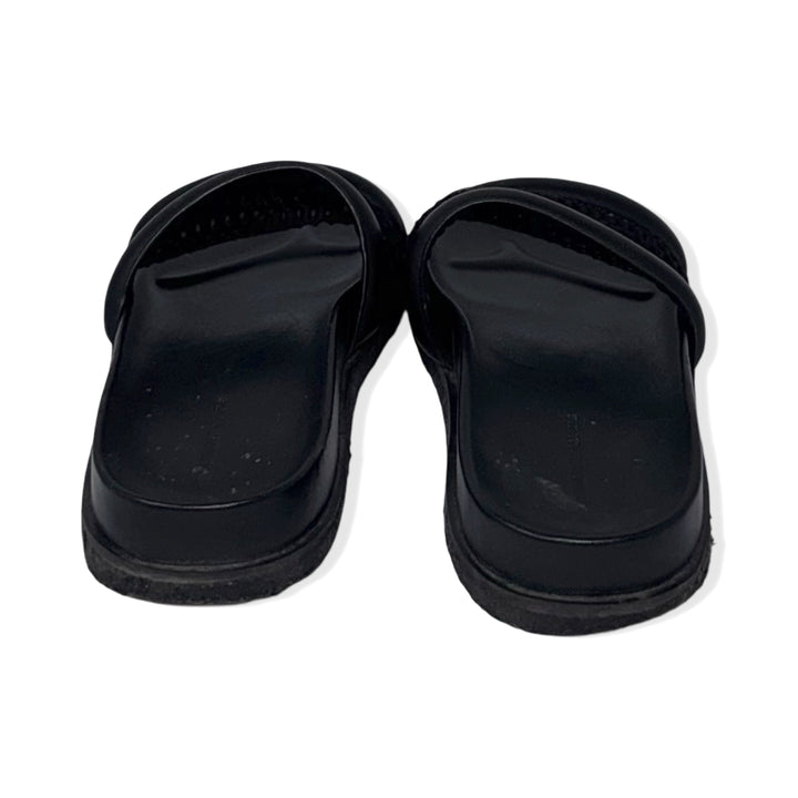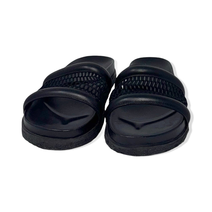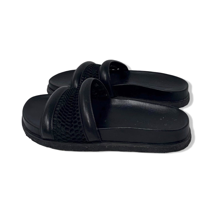 - Slip on leather slides with mesh strap on front and contoured footbed. Signs of wear (pictured). Labeled size EU 36; approx. size US 6 Women