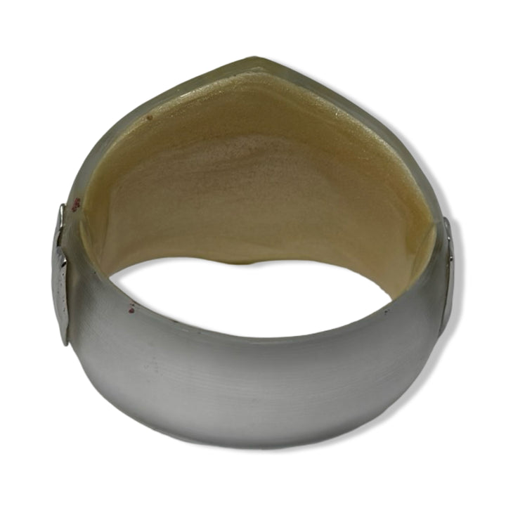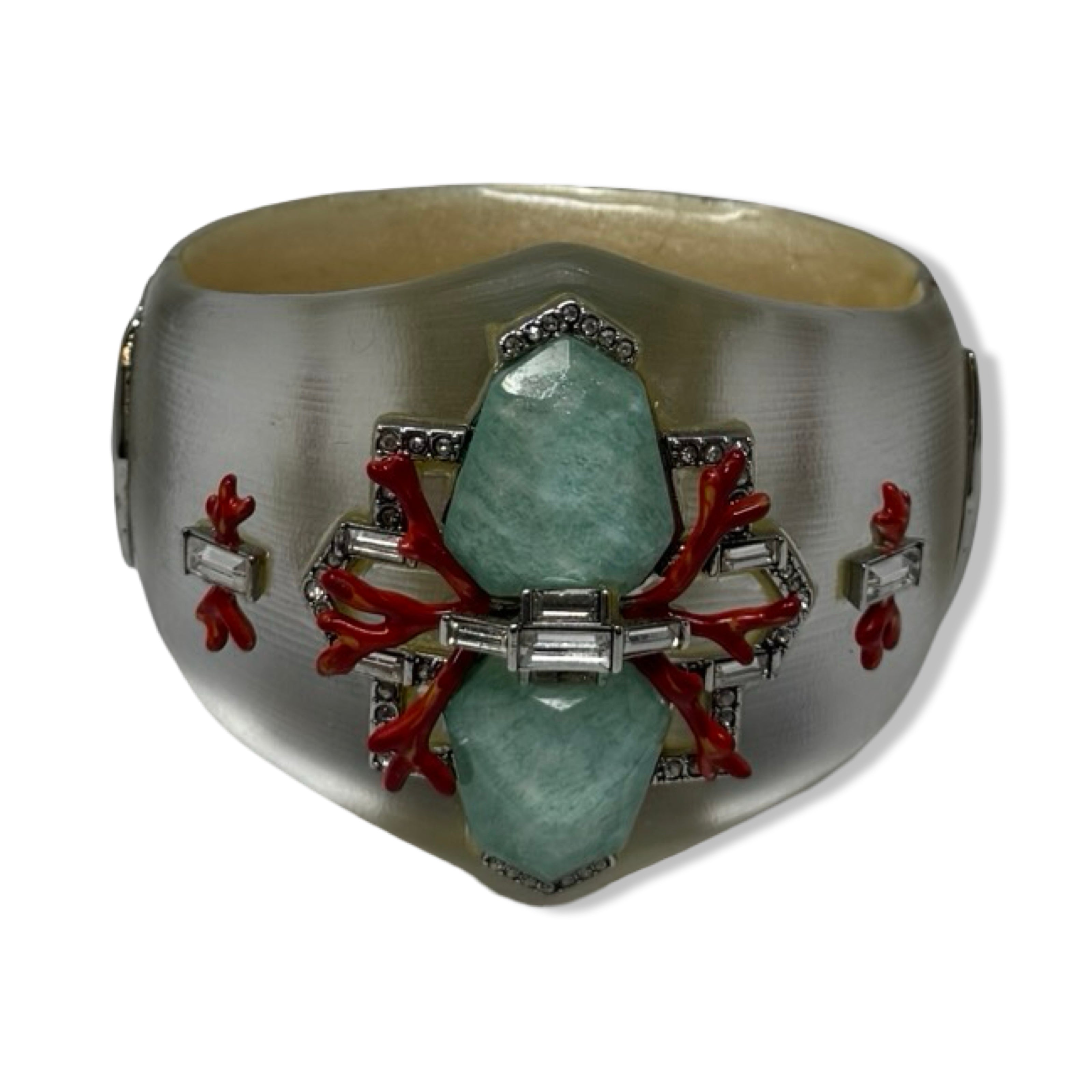 - Hinge closure cuff with crystal detail and coral enamel decor throughout. Some signs of wear