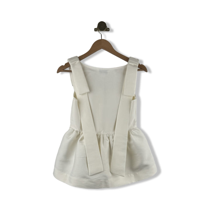 - Fit and flare peplum top with bow-detailed straps, side seam zip closure, and a jacquard satin material.