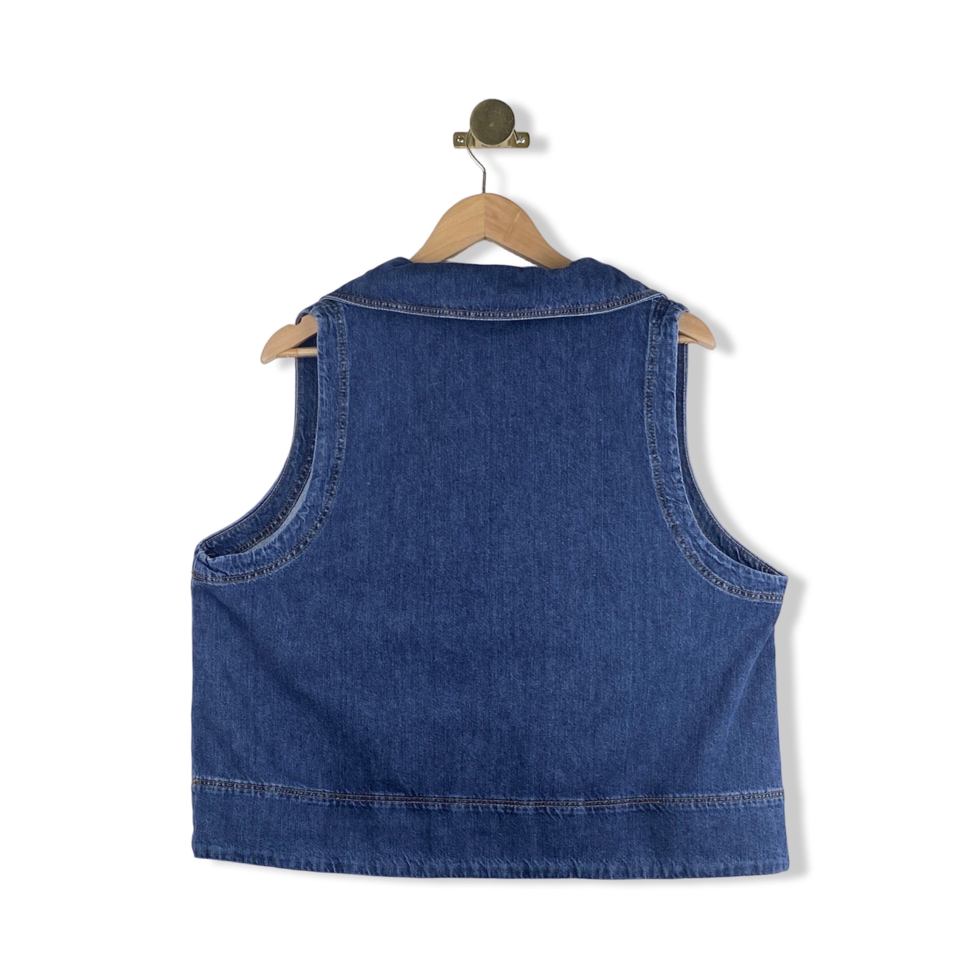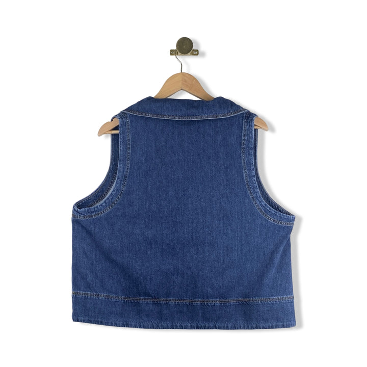 - Sleeveless denim top with v-neckline, button closure and a boxy fit.