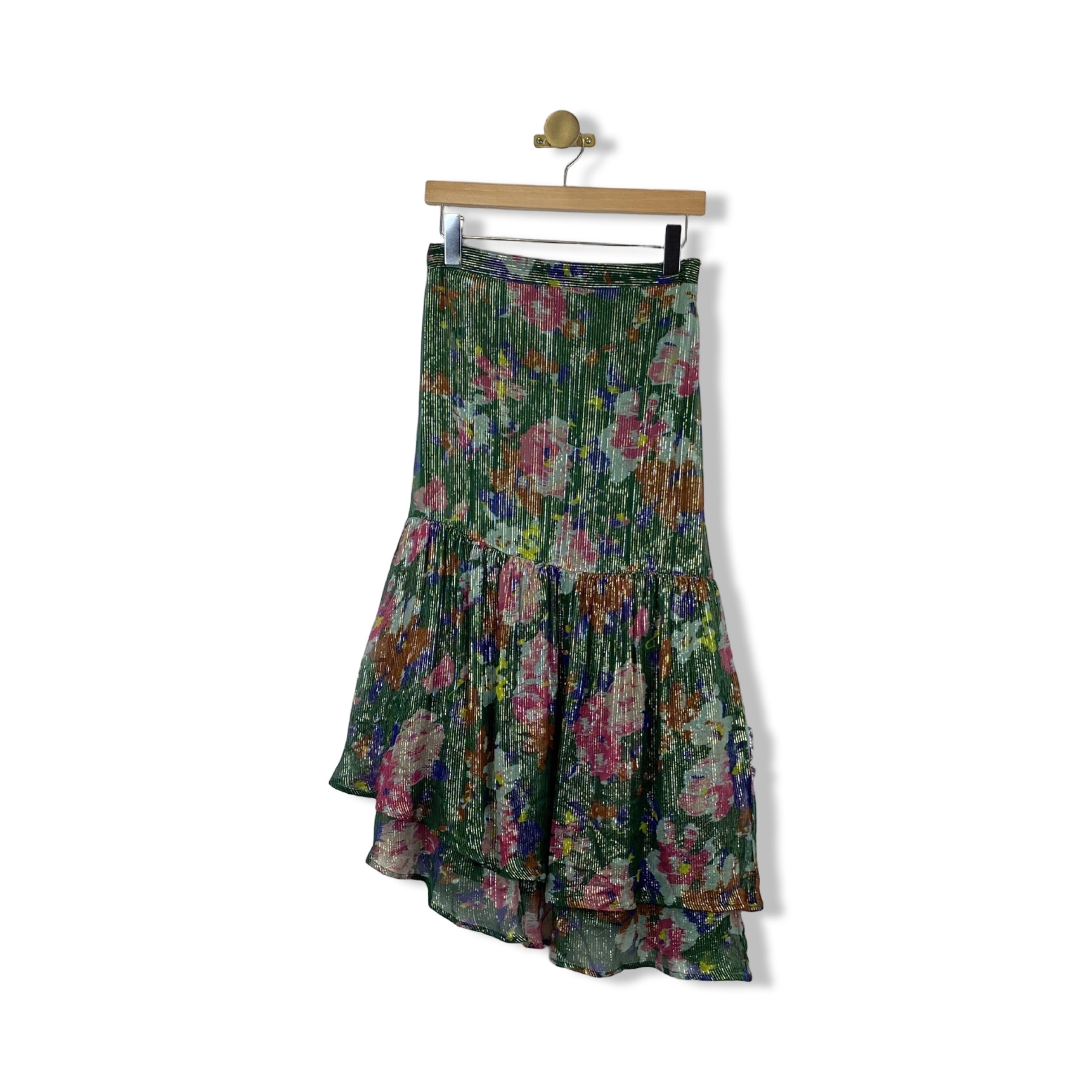 - Lurex thread hi-lo midi skirt with gathered seam front detail and side zip closure
