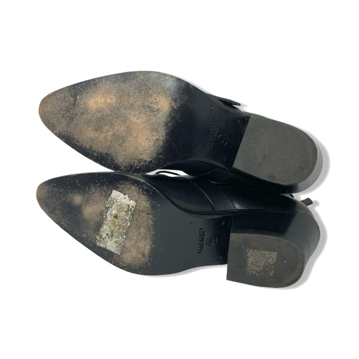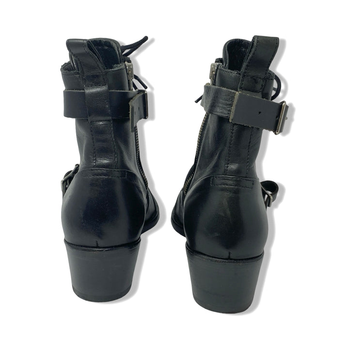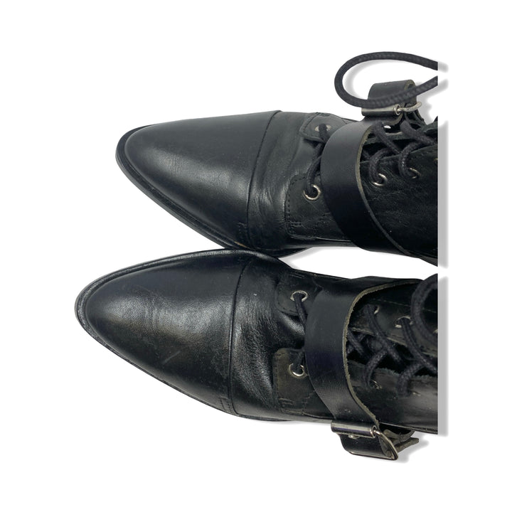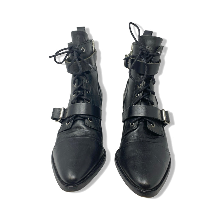 - Pointed toe lace up boots with buckle closure straps and a side zip closure.