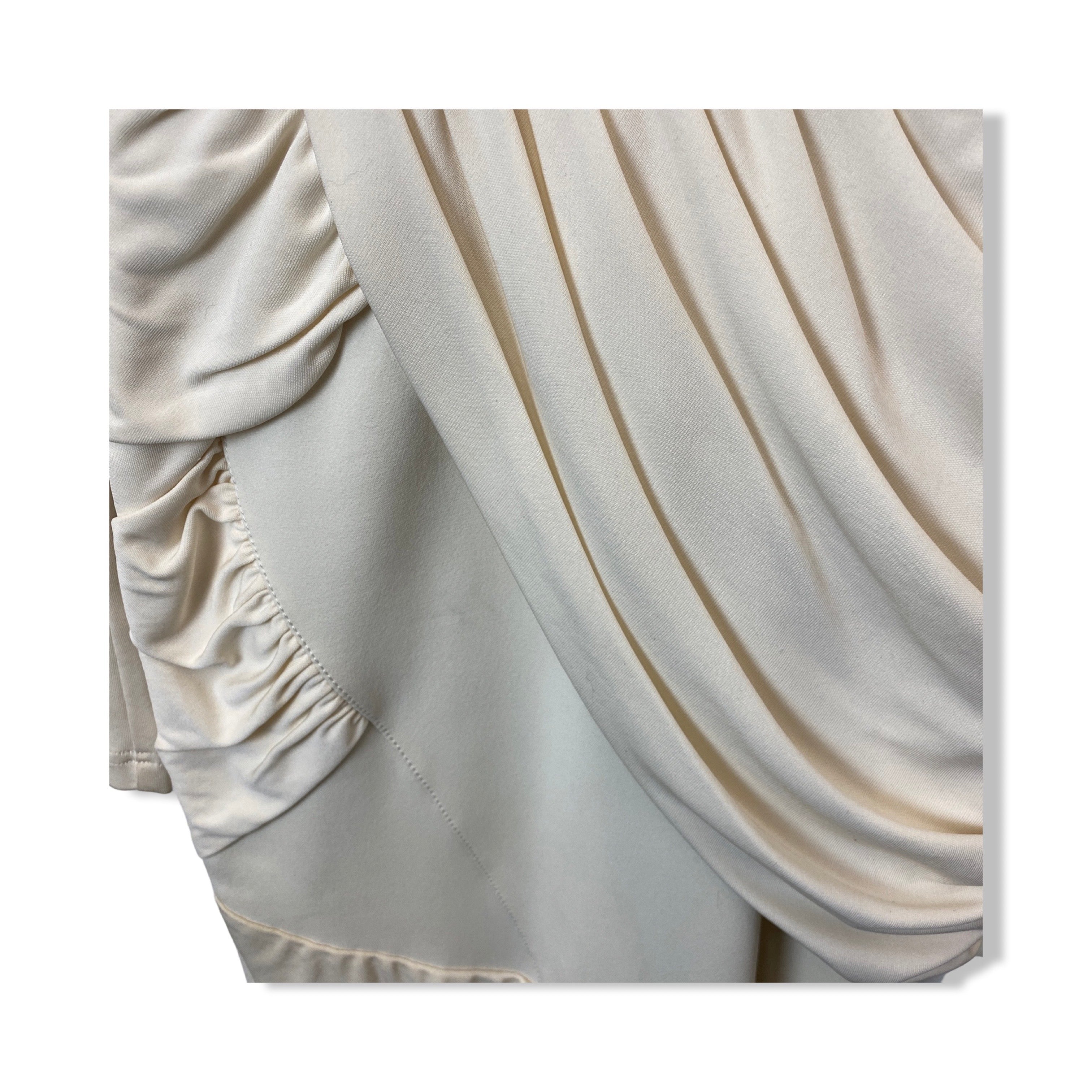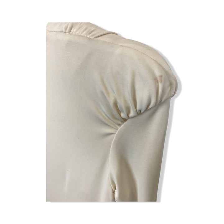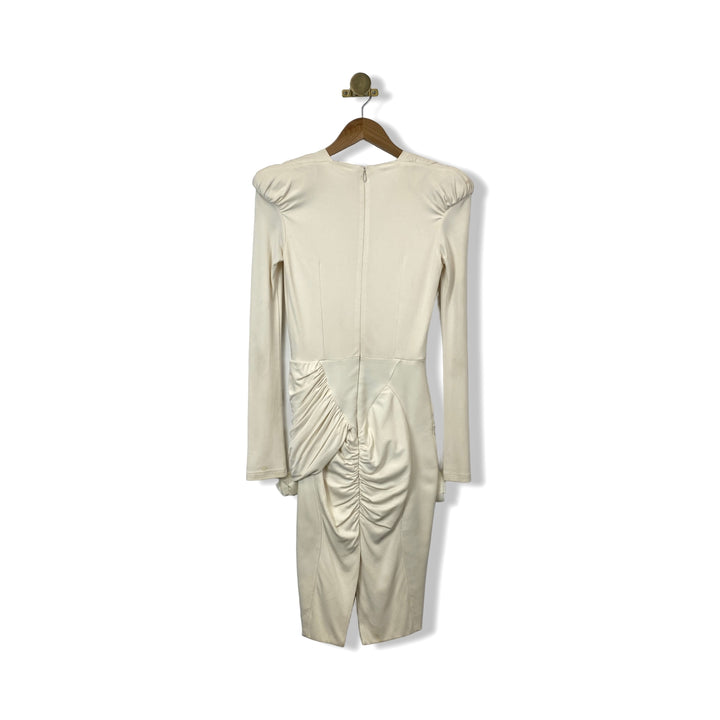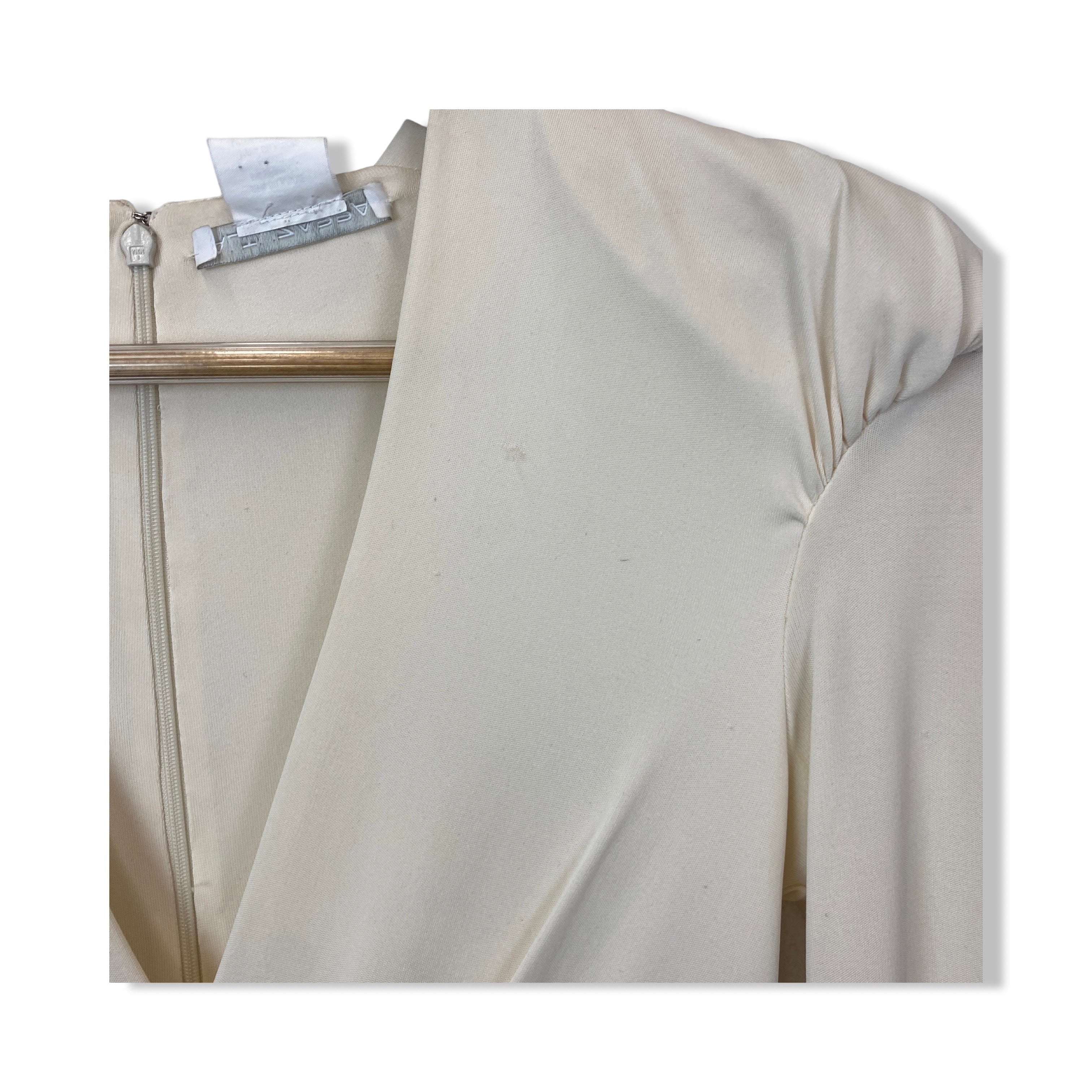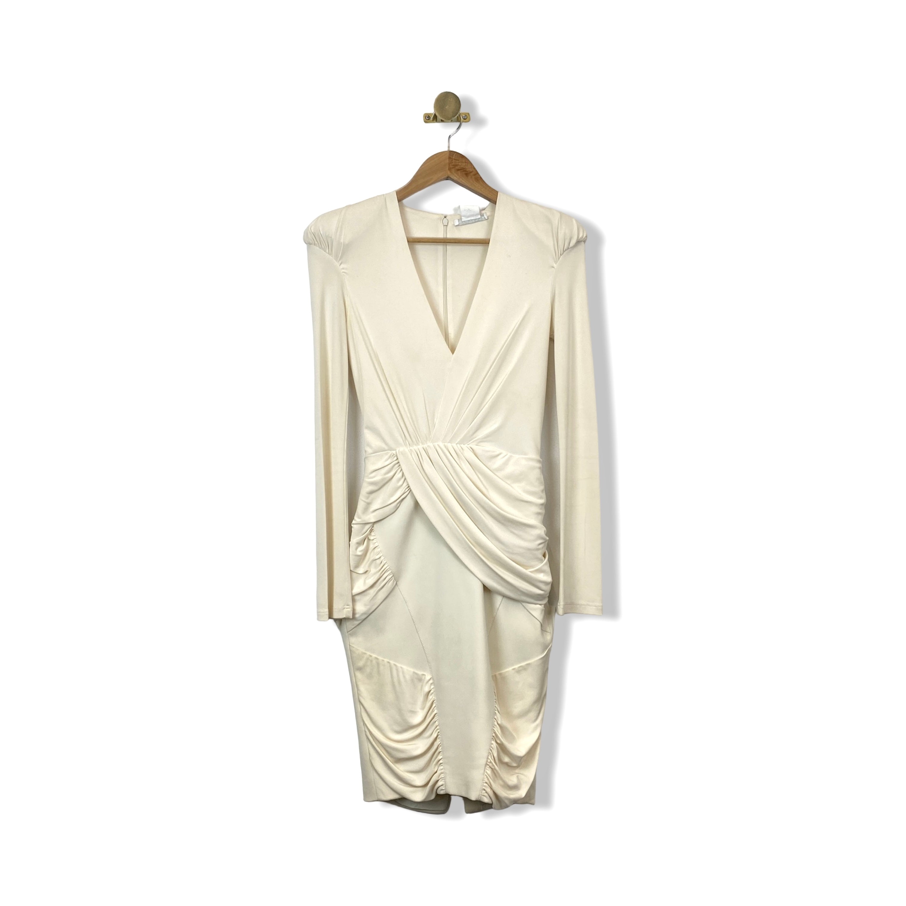 - Long sleeve mini dress with pleated drape detail on front, deep v-neckline, padded shoulders and zip closure on back. Some signs of wear.
