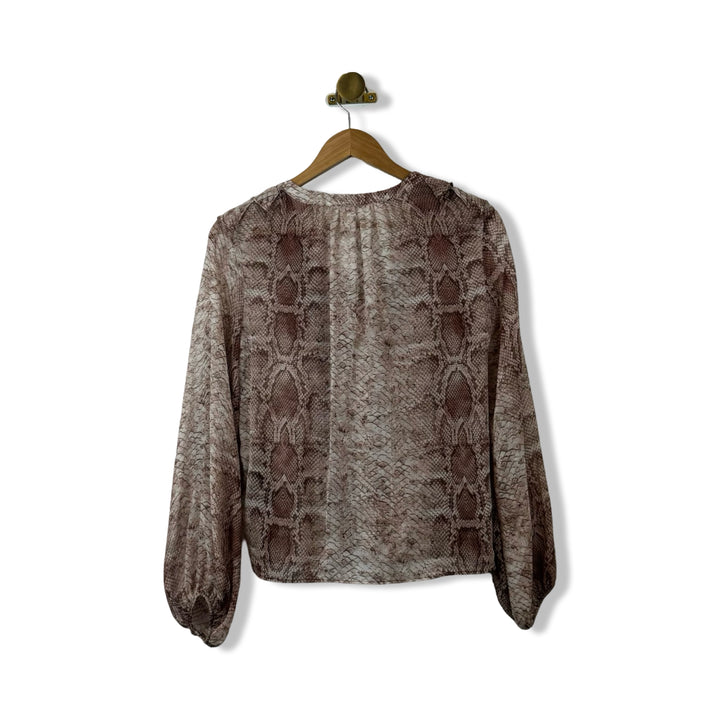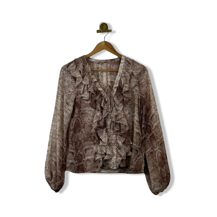 - Add some wildness to your wardrobe with this Anthropologie snake print long sleeve top. The V-neckline and ruffled accents give it a bohemian touch, making it perfect for a party or casual wear. The lightweight chiffon fabric makes it breathable and suitable for all seasons.