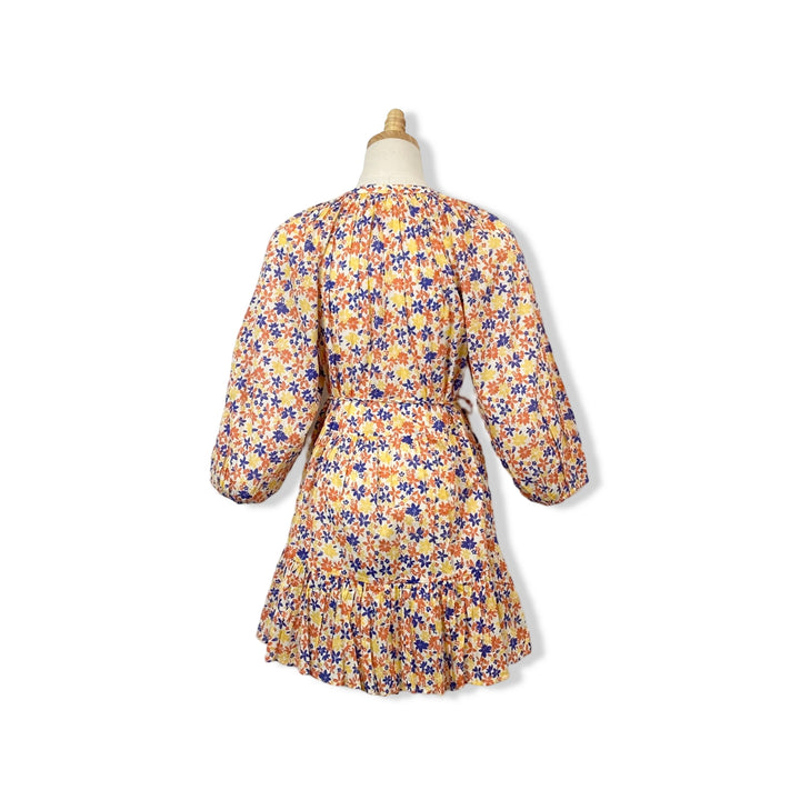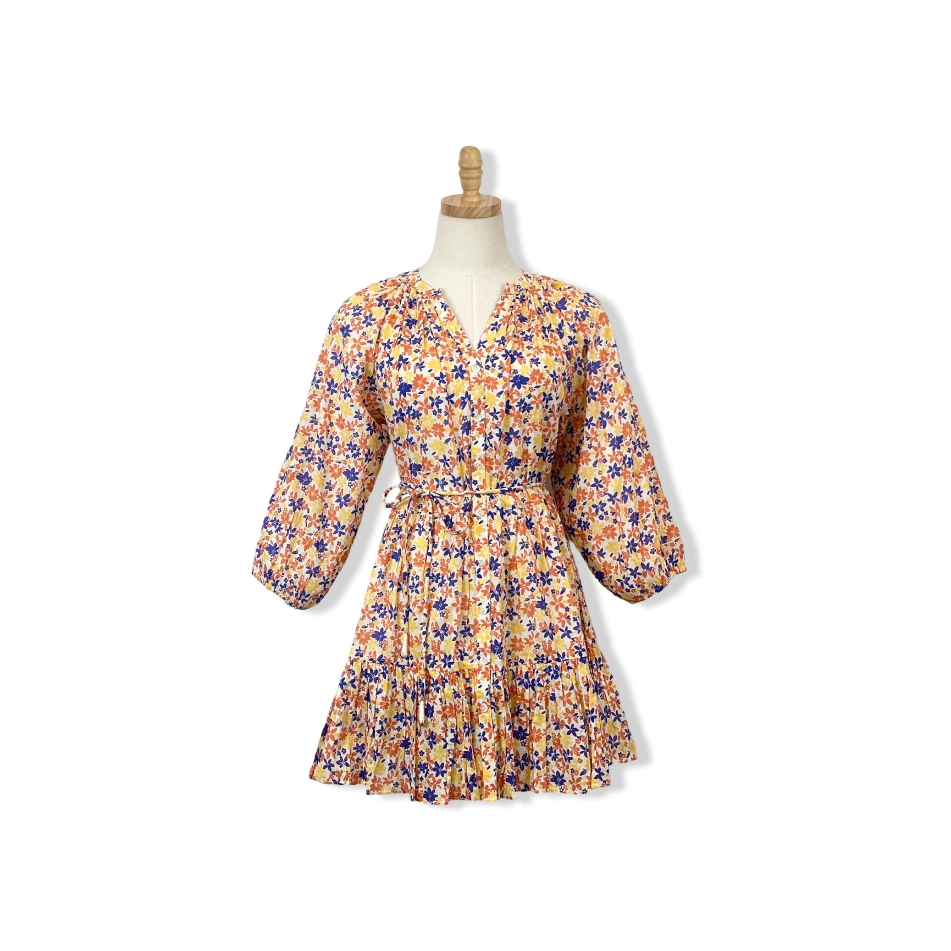 - Puff long sleeve button down dress with floral print and detachable belt.