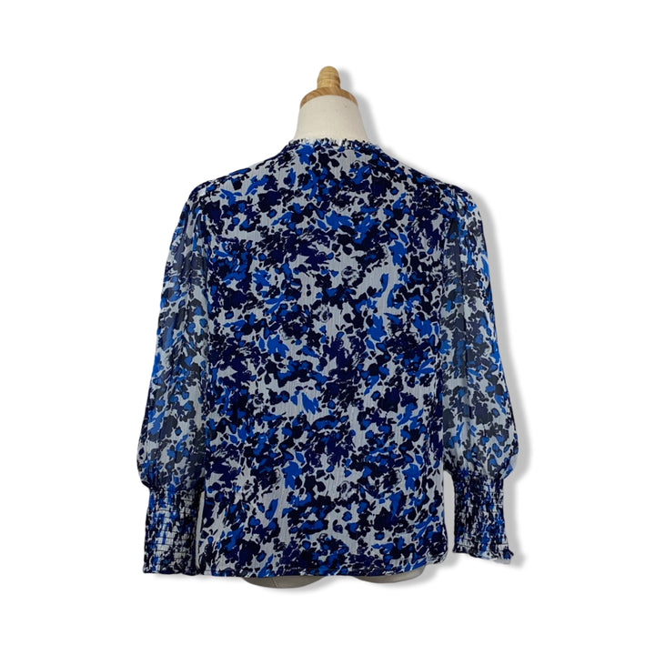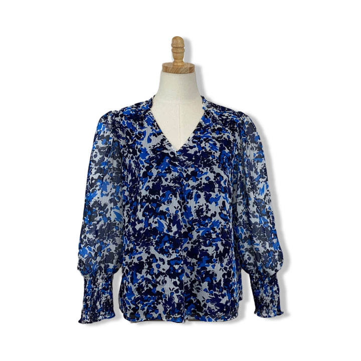 - Long sleeve floral V-neck top with faux button closure and shirred cuffs.
