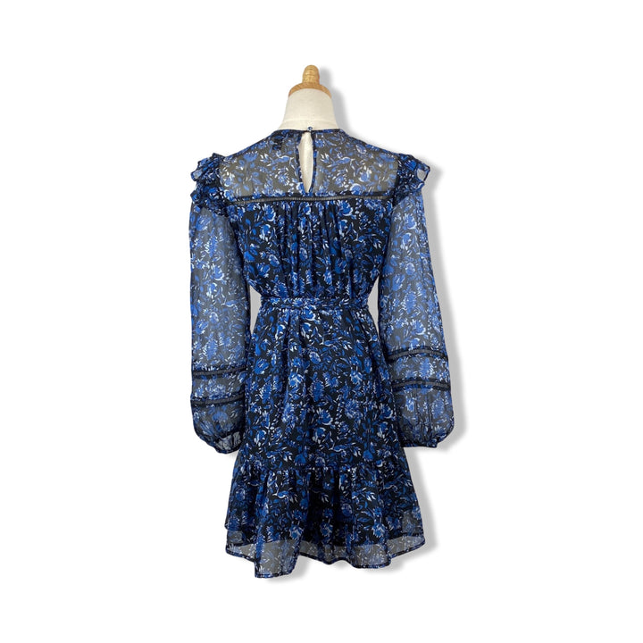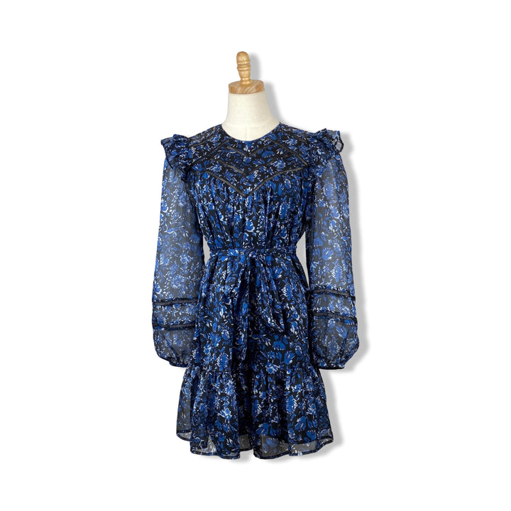 - Long sleeve mini dress with keyhole button closure, self tie at waist, and eyelet detail throughout