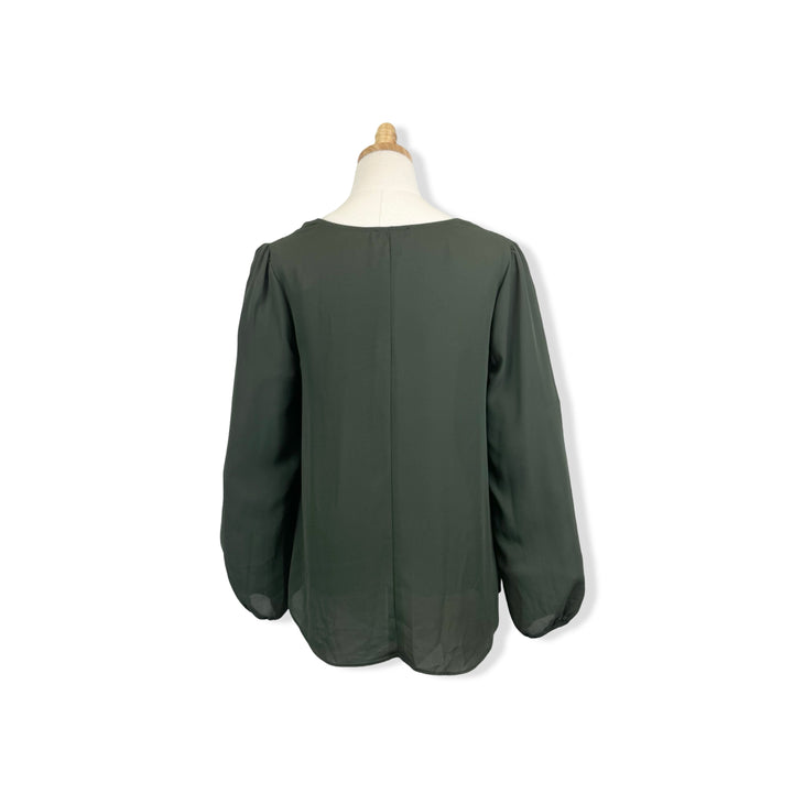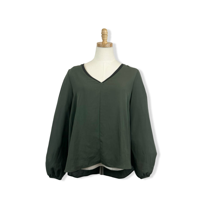 - Woven Blouse with knit V-neck and elasticized cuffs