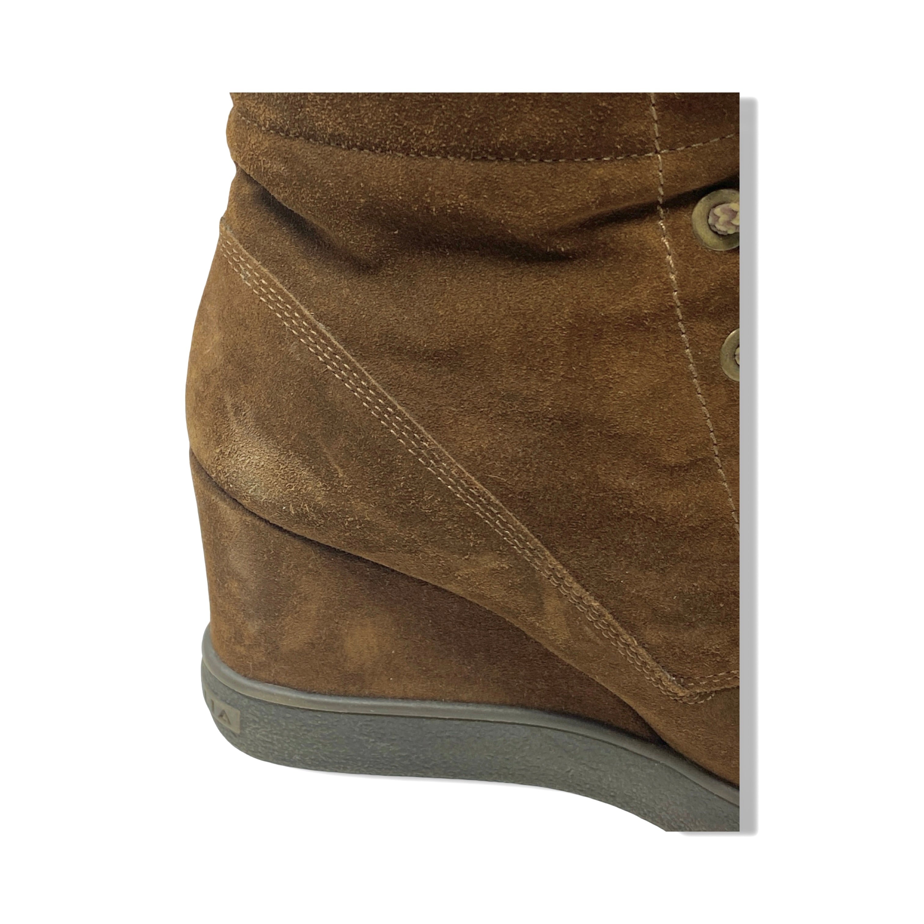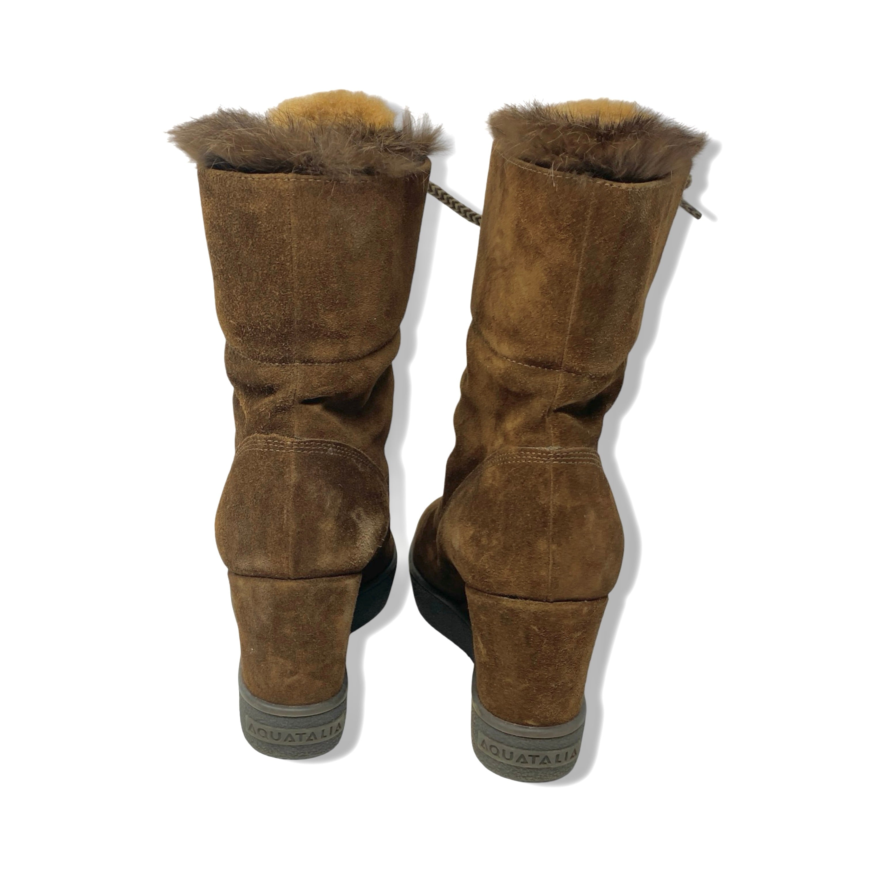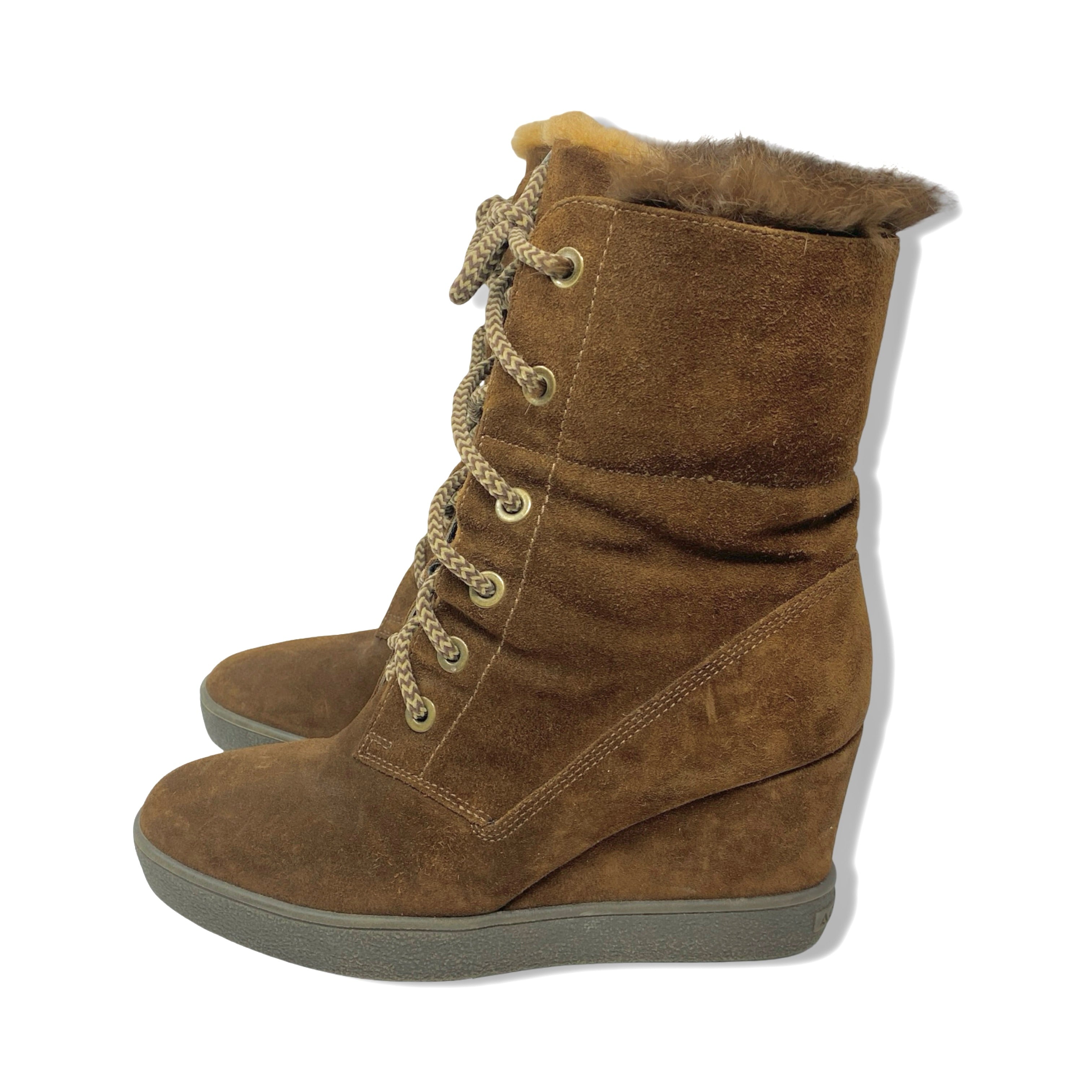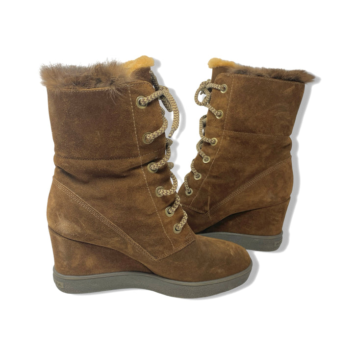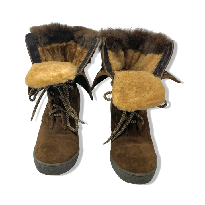 - Lace up suede boot with wedge platform, fold over design and rabbit fur shearling lining.