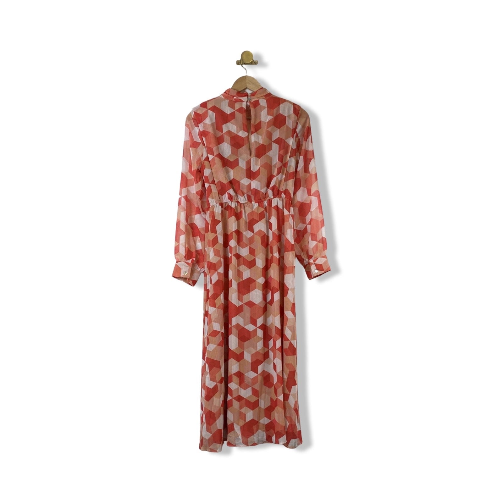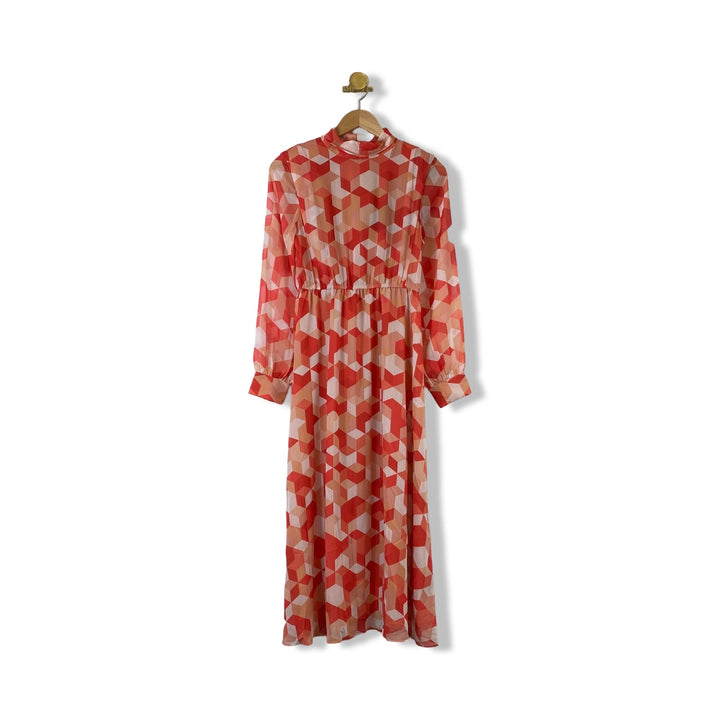 - This party-ready dress features a smocked mock neckline, billowy long sleeves, and a vibrant, contemporary geometric print. It exudes a polished and modern feel, perfect for any occasion.