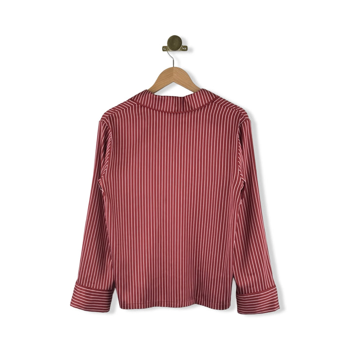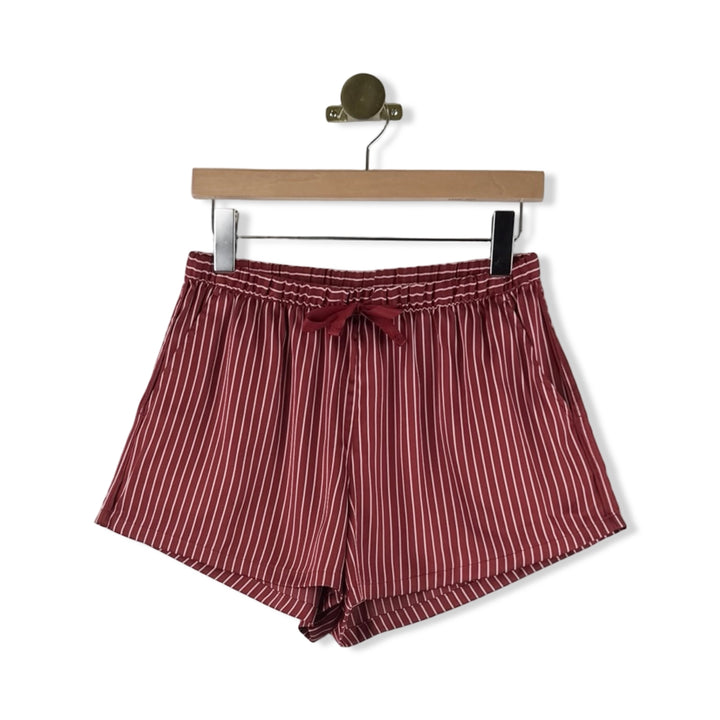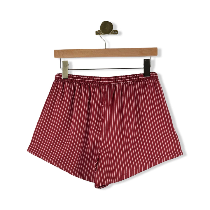 - Striped pajama set with button down long sleeve top and elasticized waistband shorts