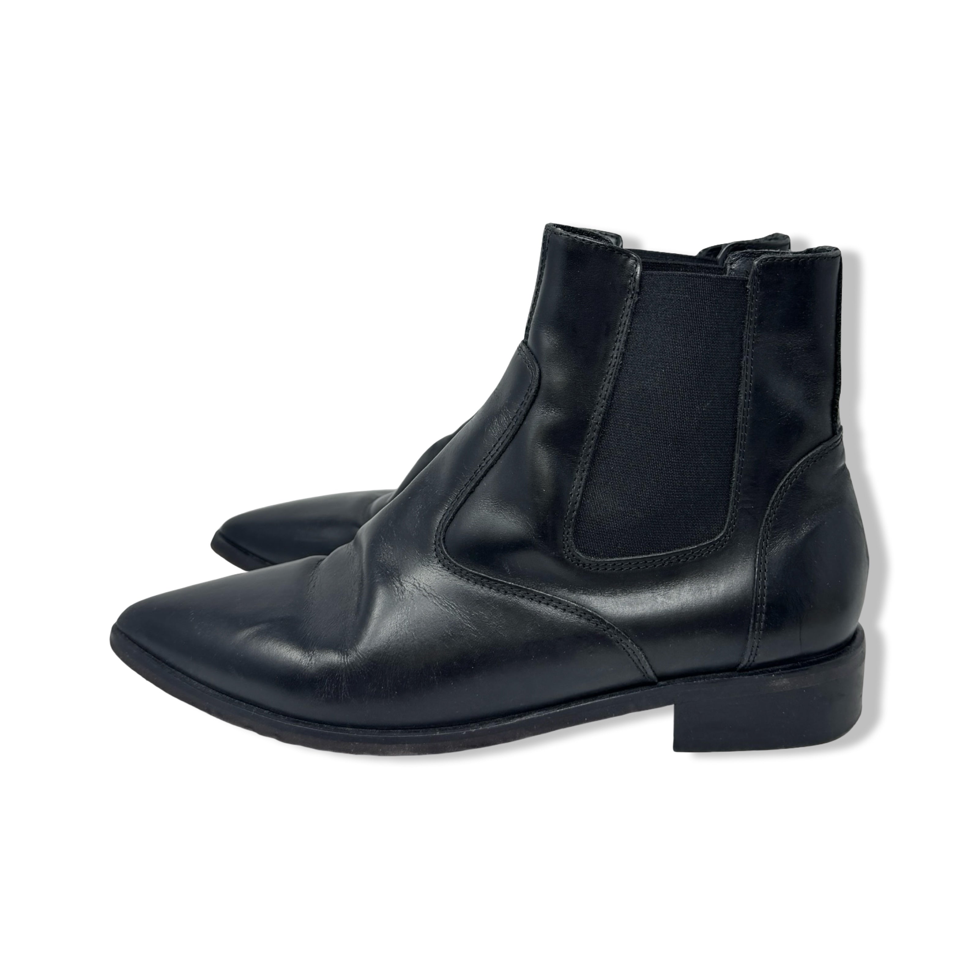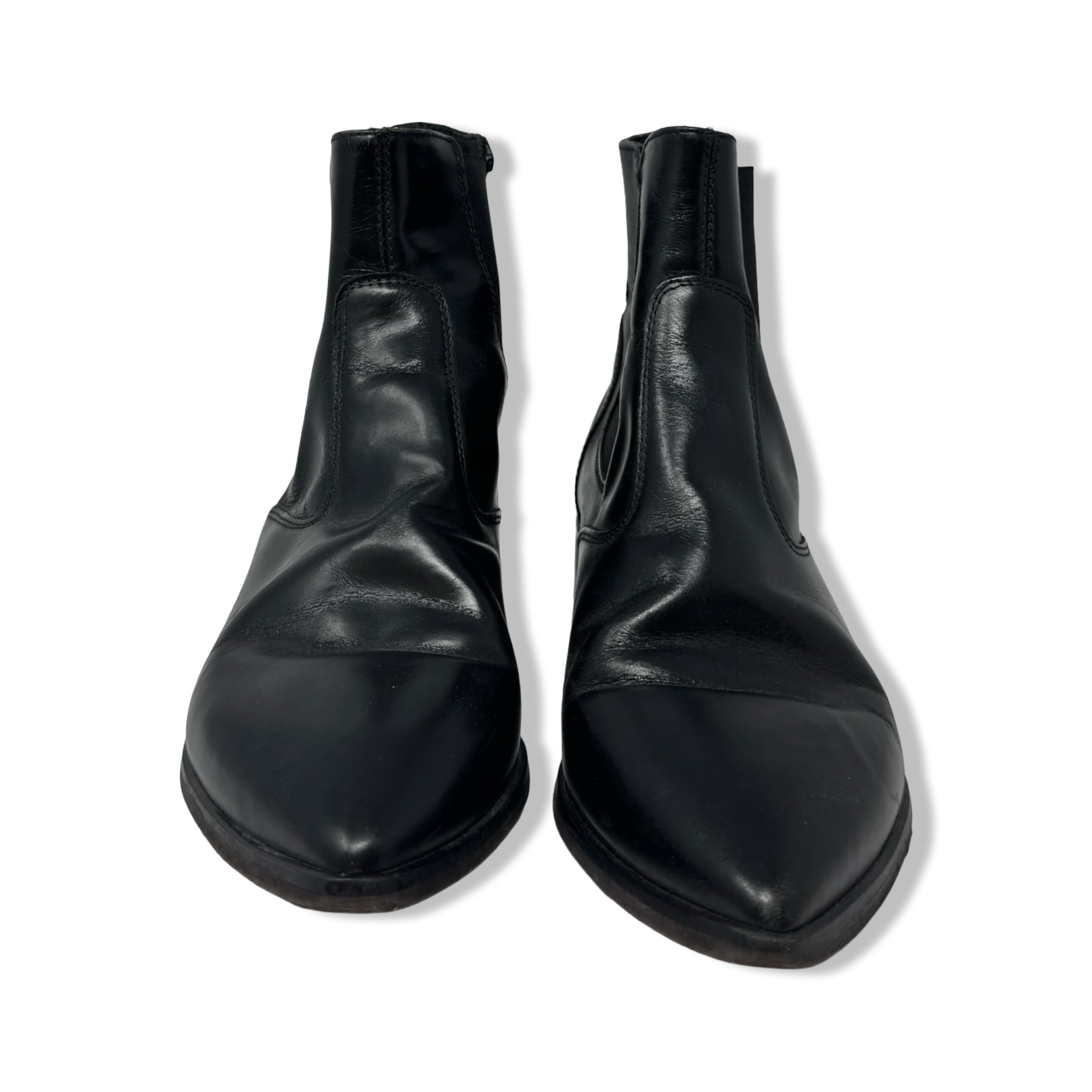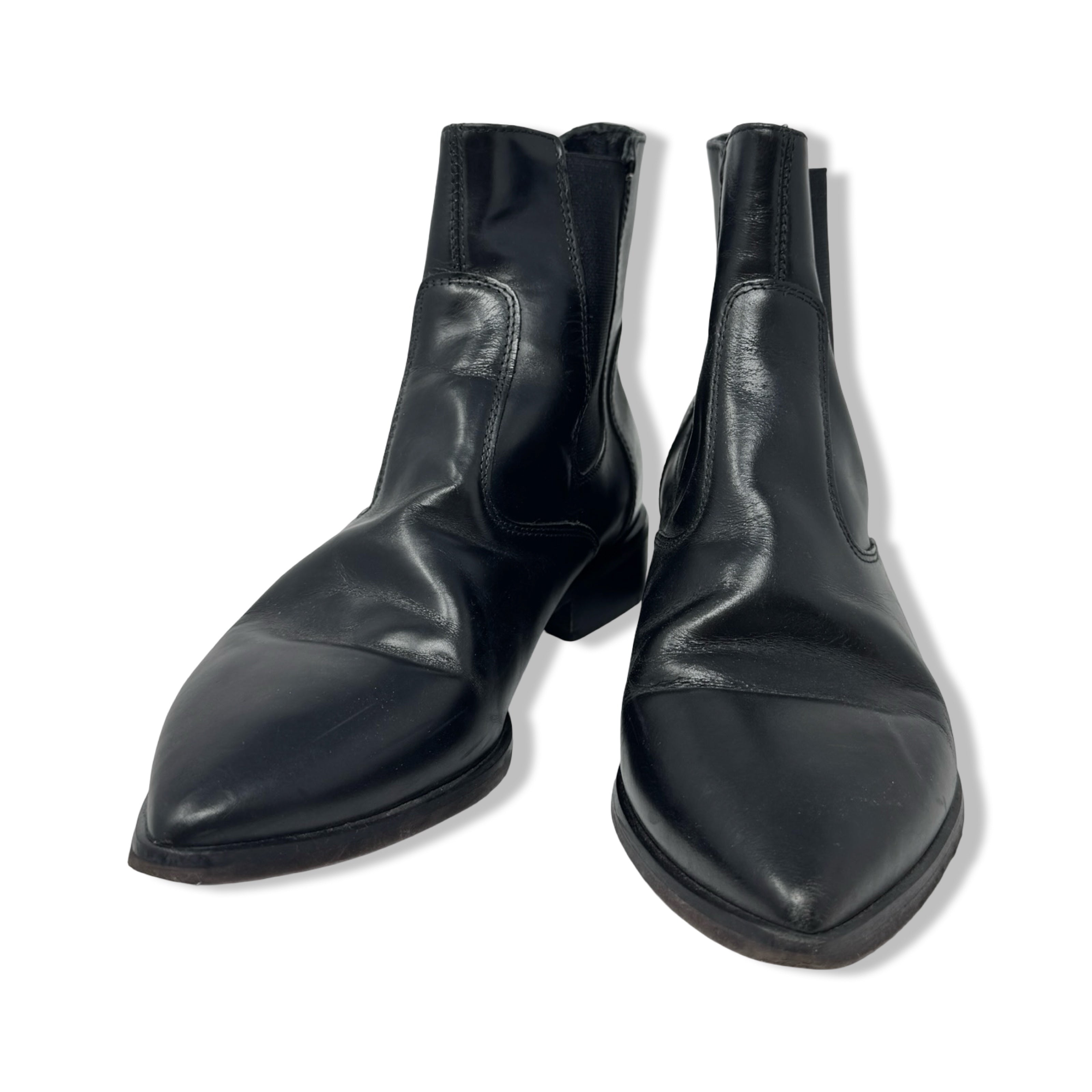 - Pointed toe pull on Chelsea boots with elastic side panels. Some signs of wear. Labeled size IT 39 Women