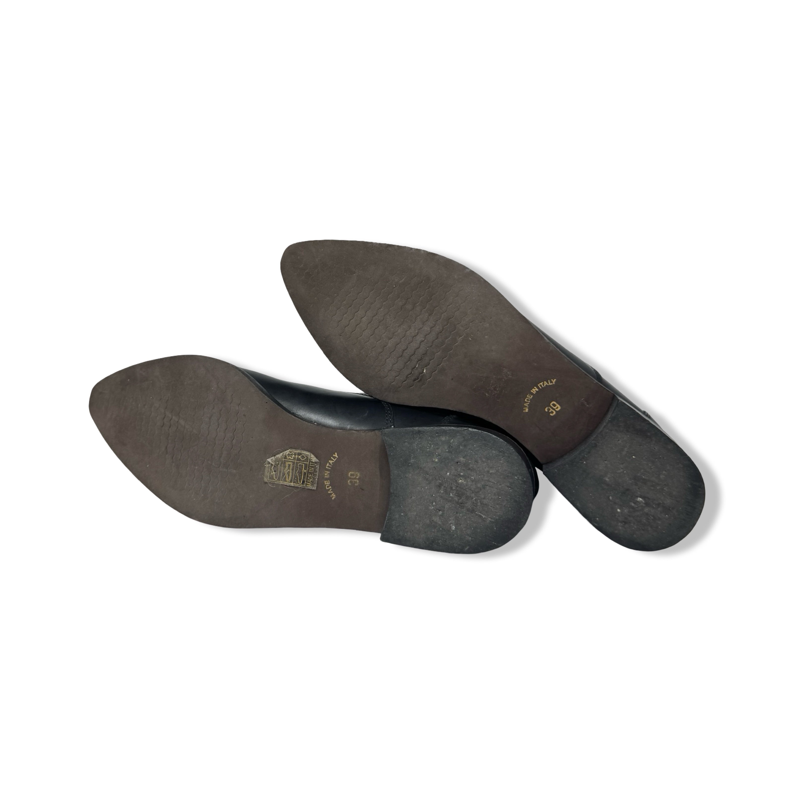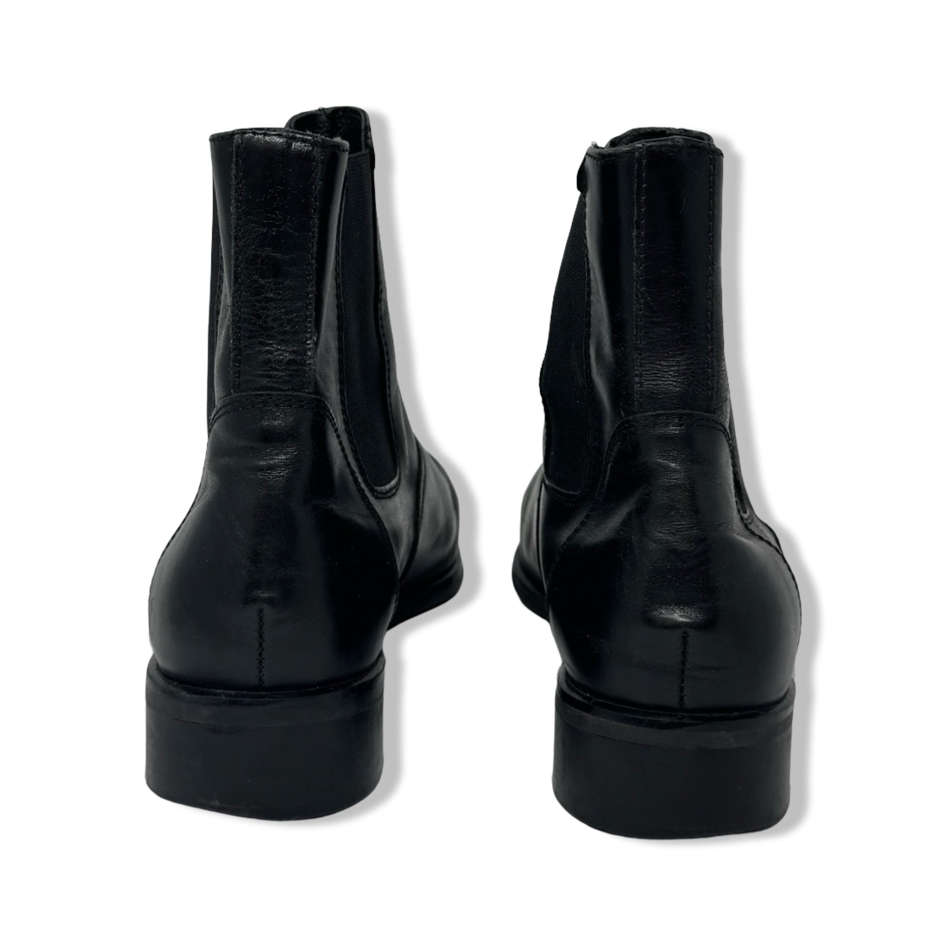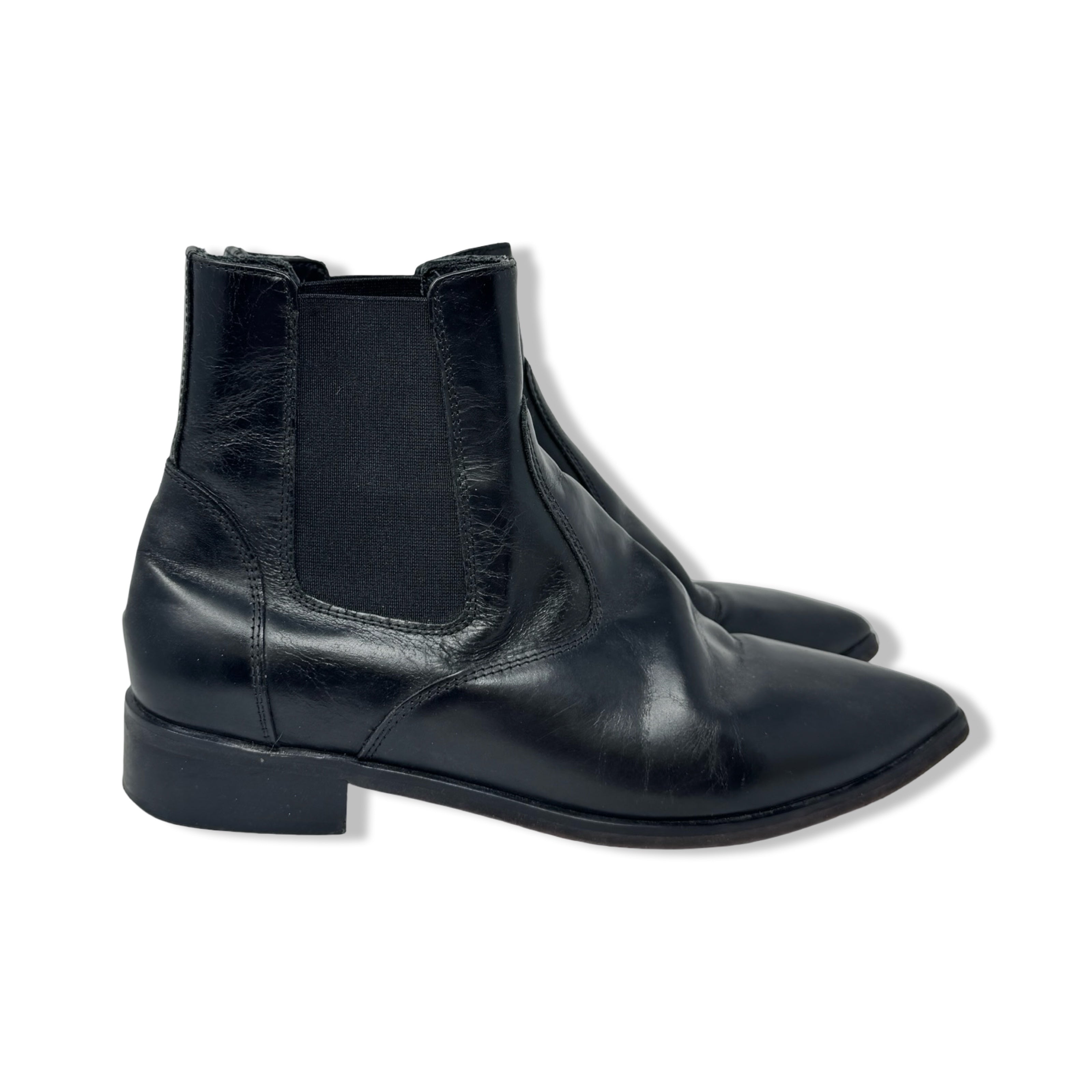 - Pointed toe pull on Chelsea boots with elastic side panels. Some signs of wear. Labeled size IT 39 Women