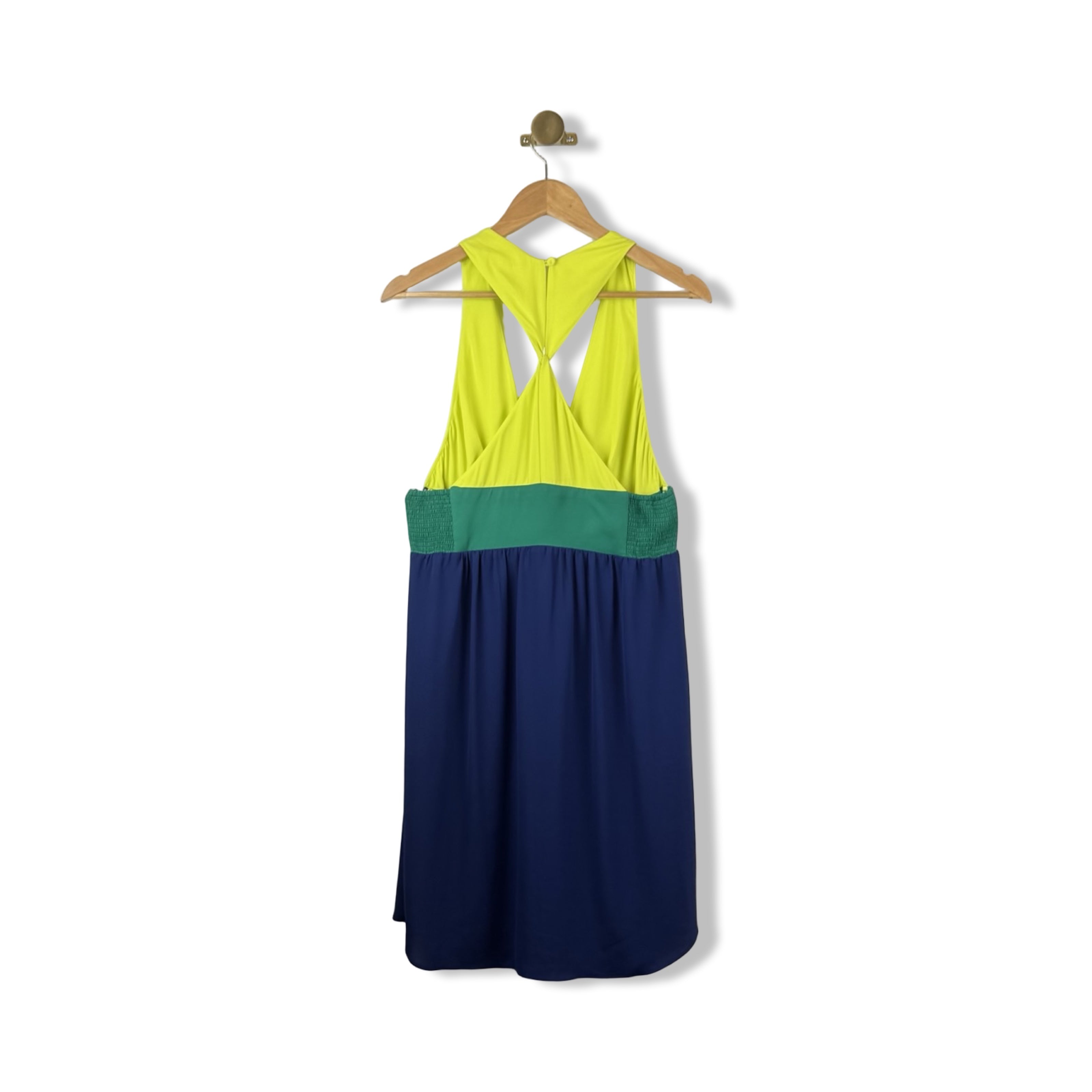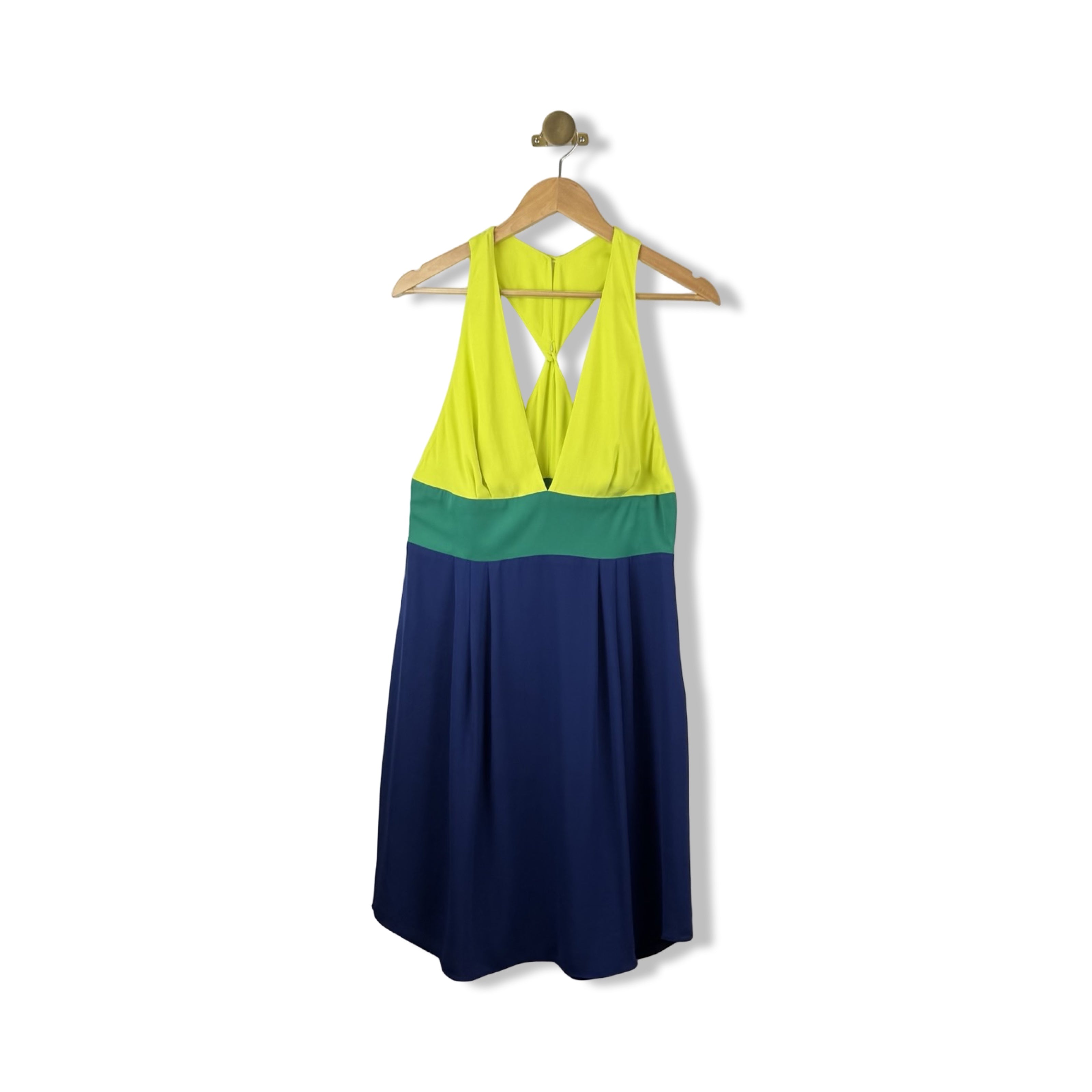 - sleeveless color-blocked mini dress with knotted racerback detail.