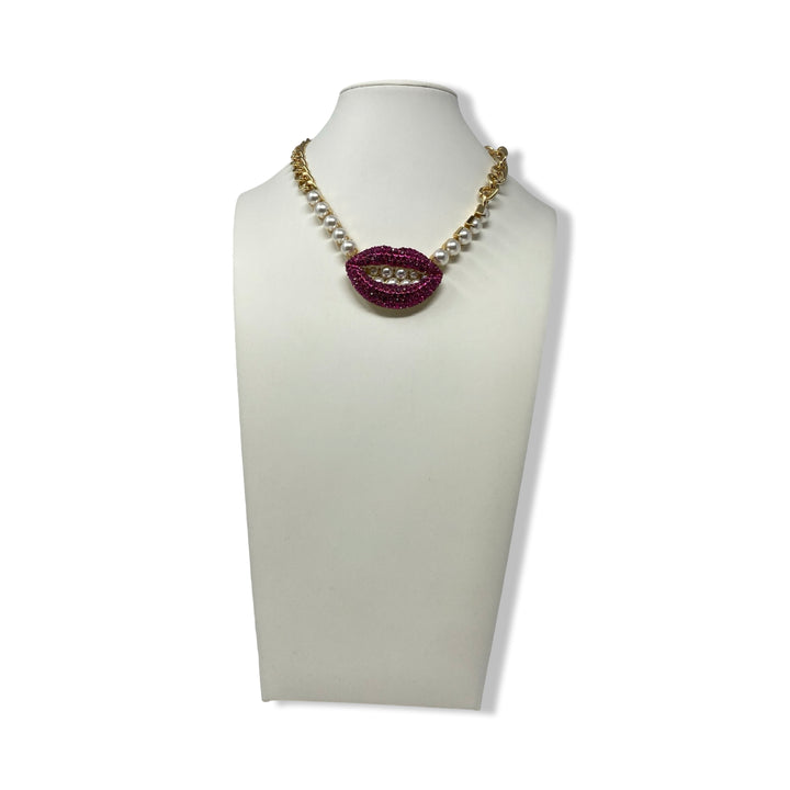 - Link chain necklace with pearl stones and rhinestone lips pendant