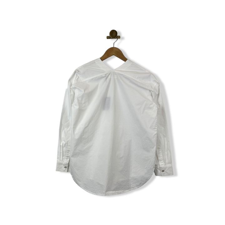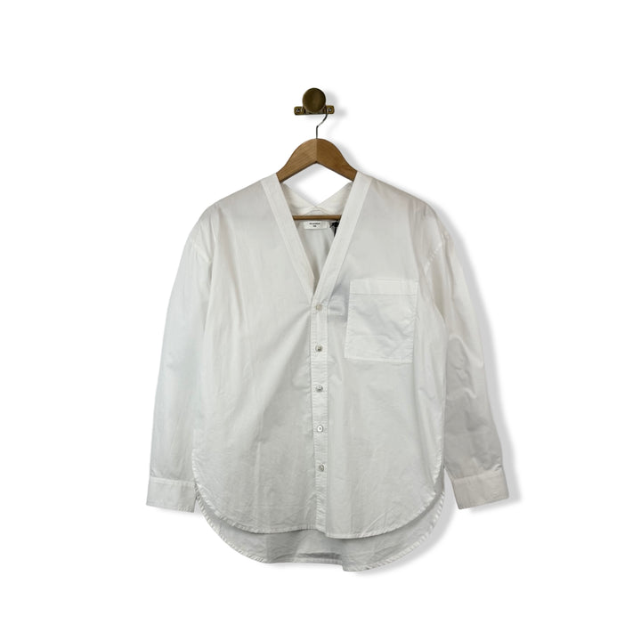 - This top features a structured button-up design with a chest pocket and collarless neckline.