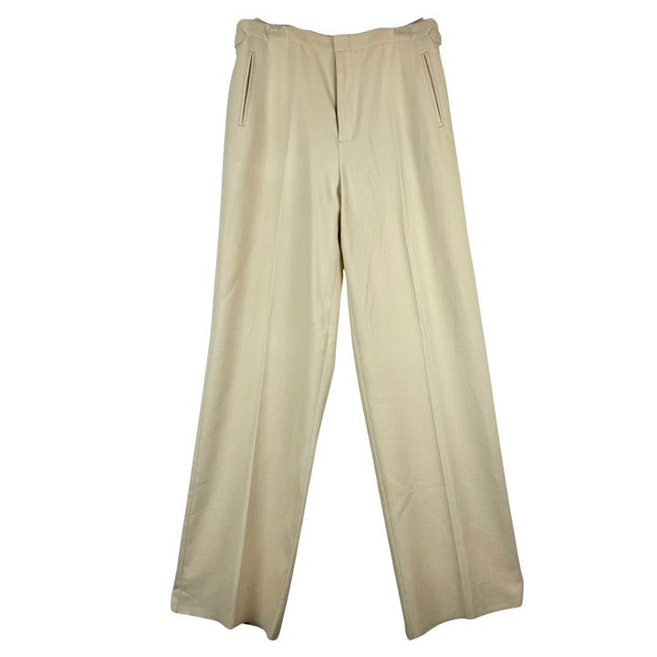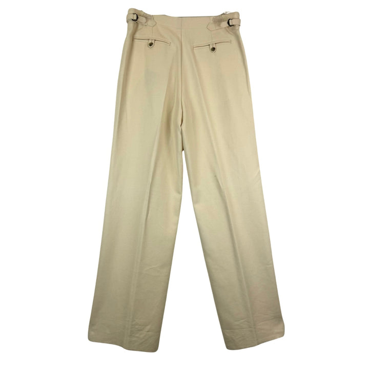 - High waist trousers with front/back pockets, pull tabs with brass belt buckles and zip fly with hook-and-bar closure
