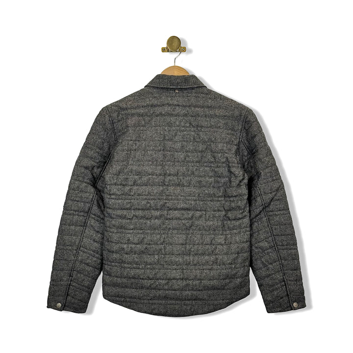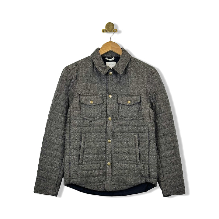 - Crafted with textured fabric and featuring snap buttons, this jacket boasts front pockets and a stylish curved hem.