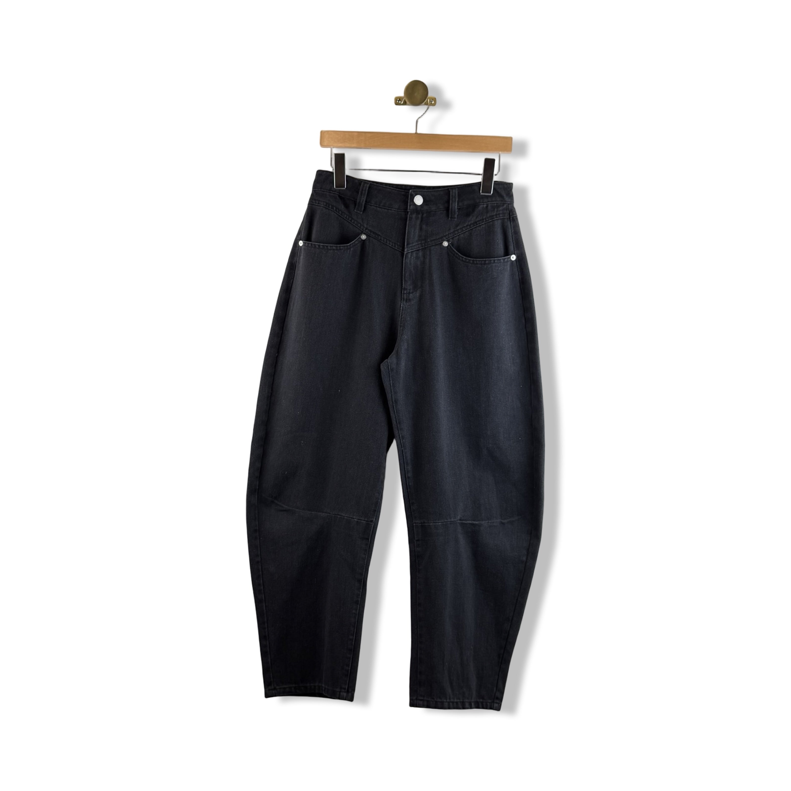 - High rise balloon jeans with dual front and back pockets. Button zip fly. Size label missing, looks like a Small