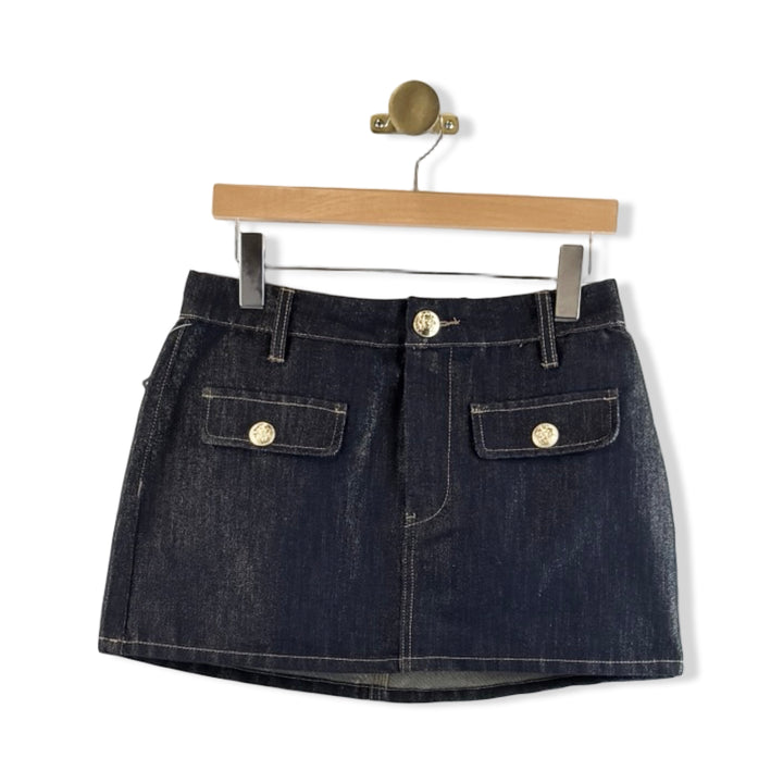 - Metallic denim mini skirt with dual front pockets and button zip fly