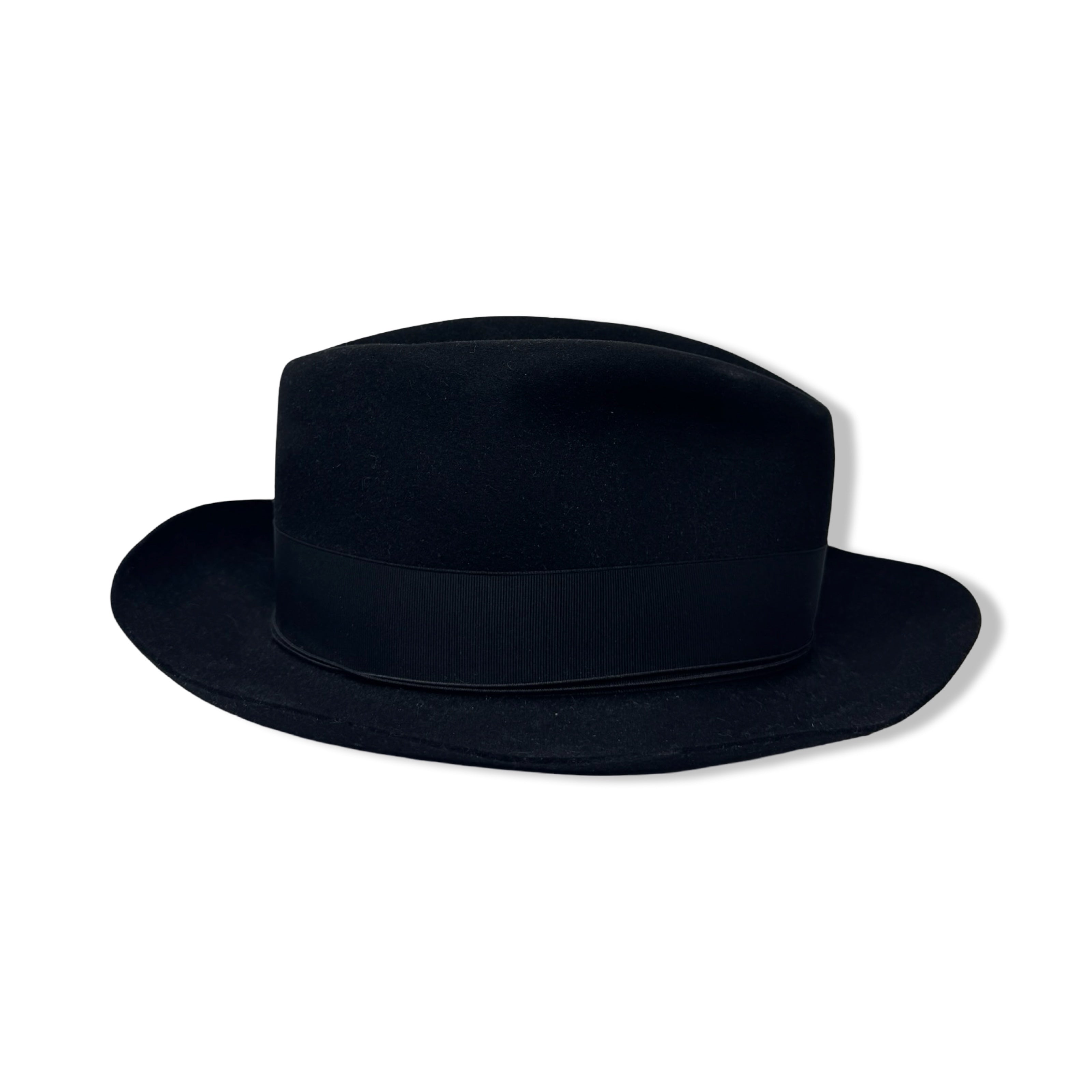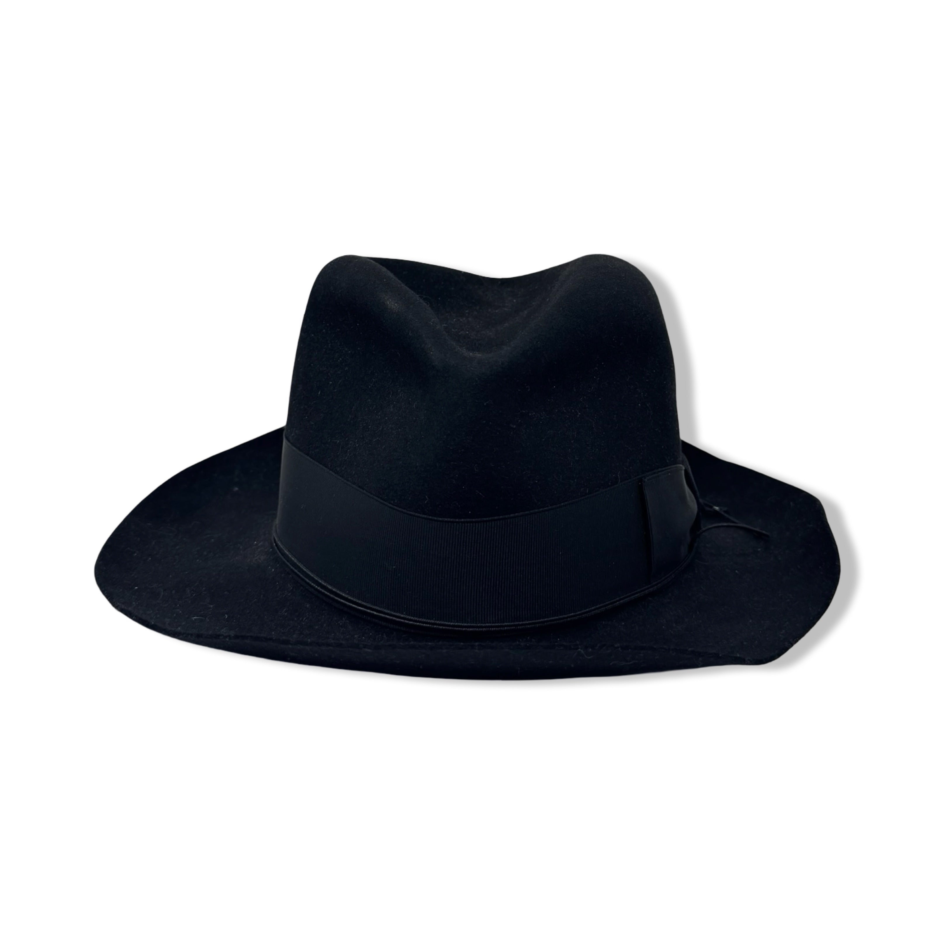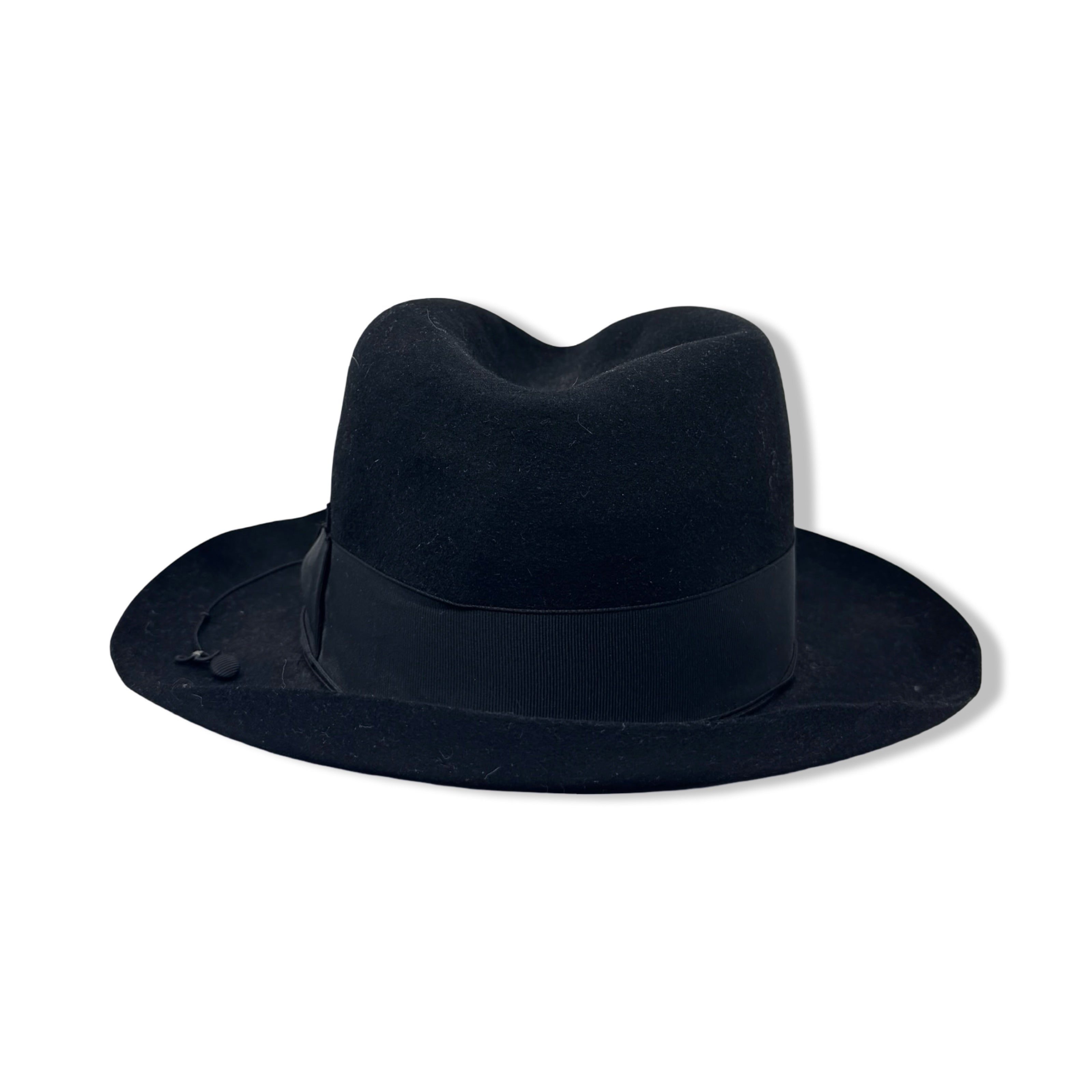 - Fur felt hat with slight curved brim and ribbon around crown. Labeled size 7 3/8