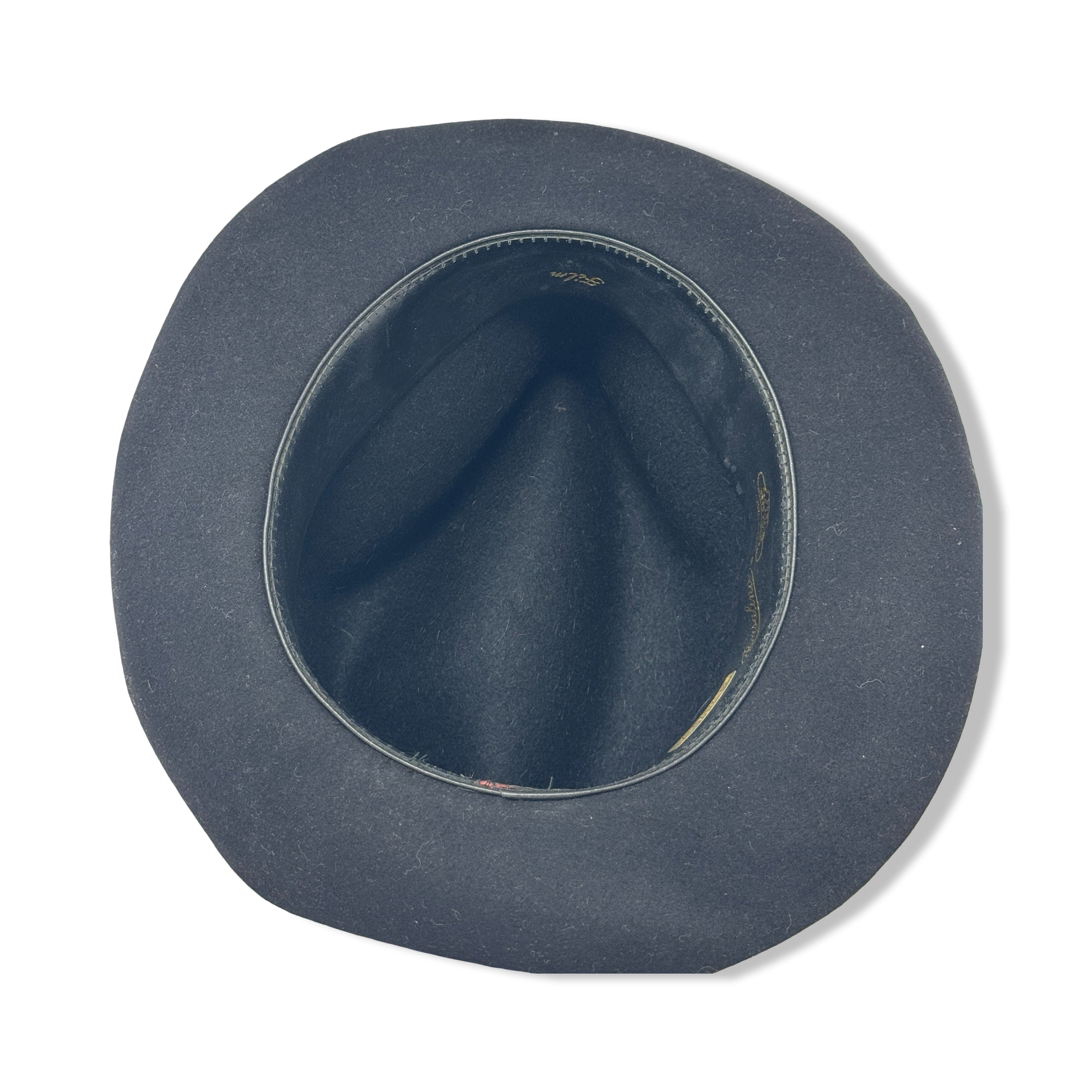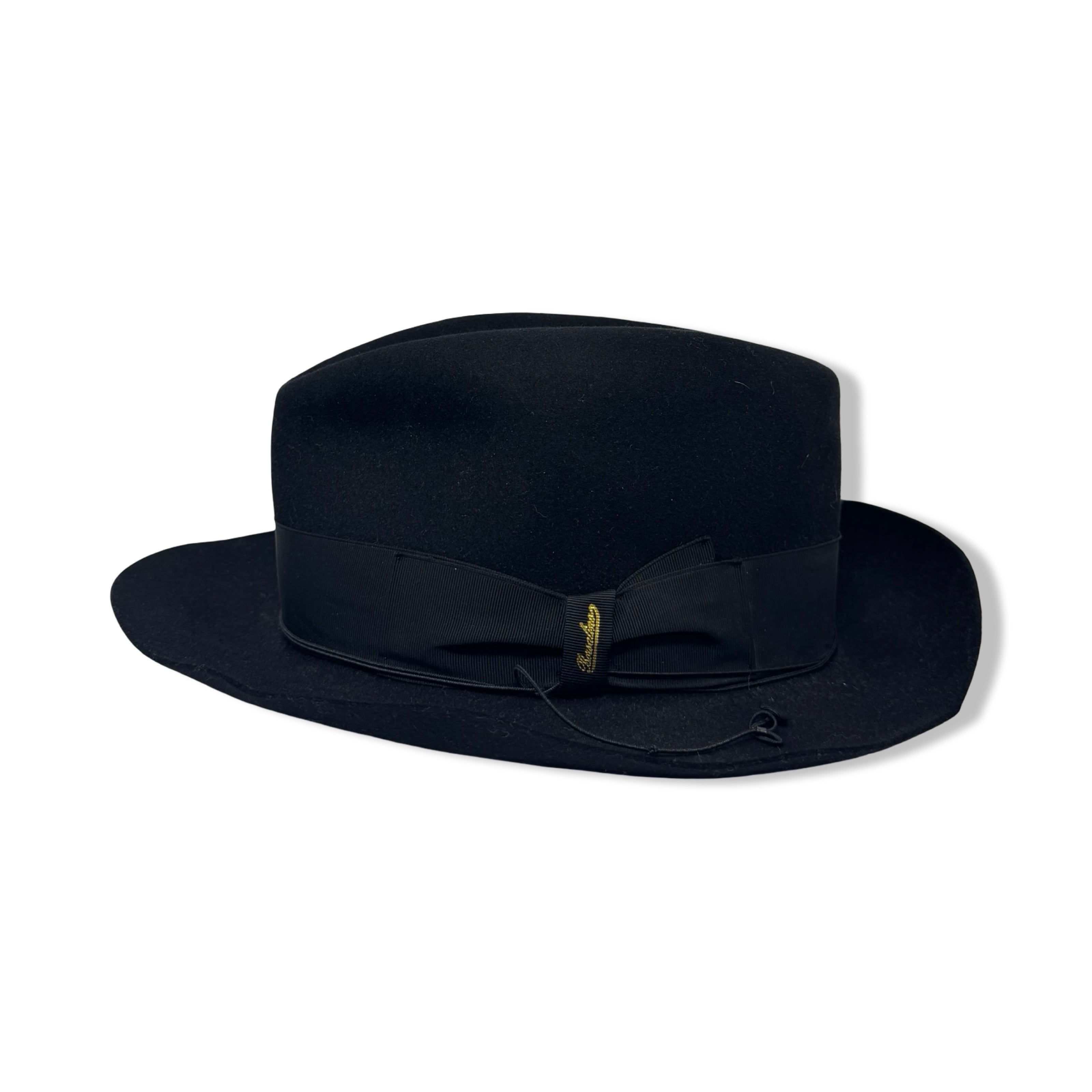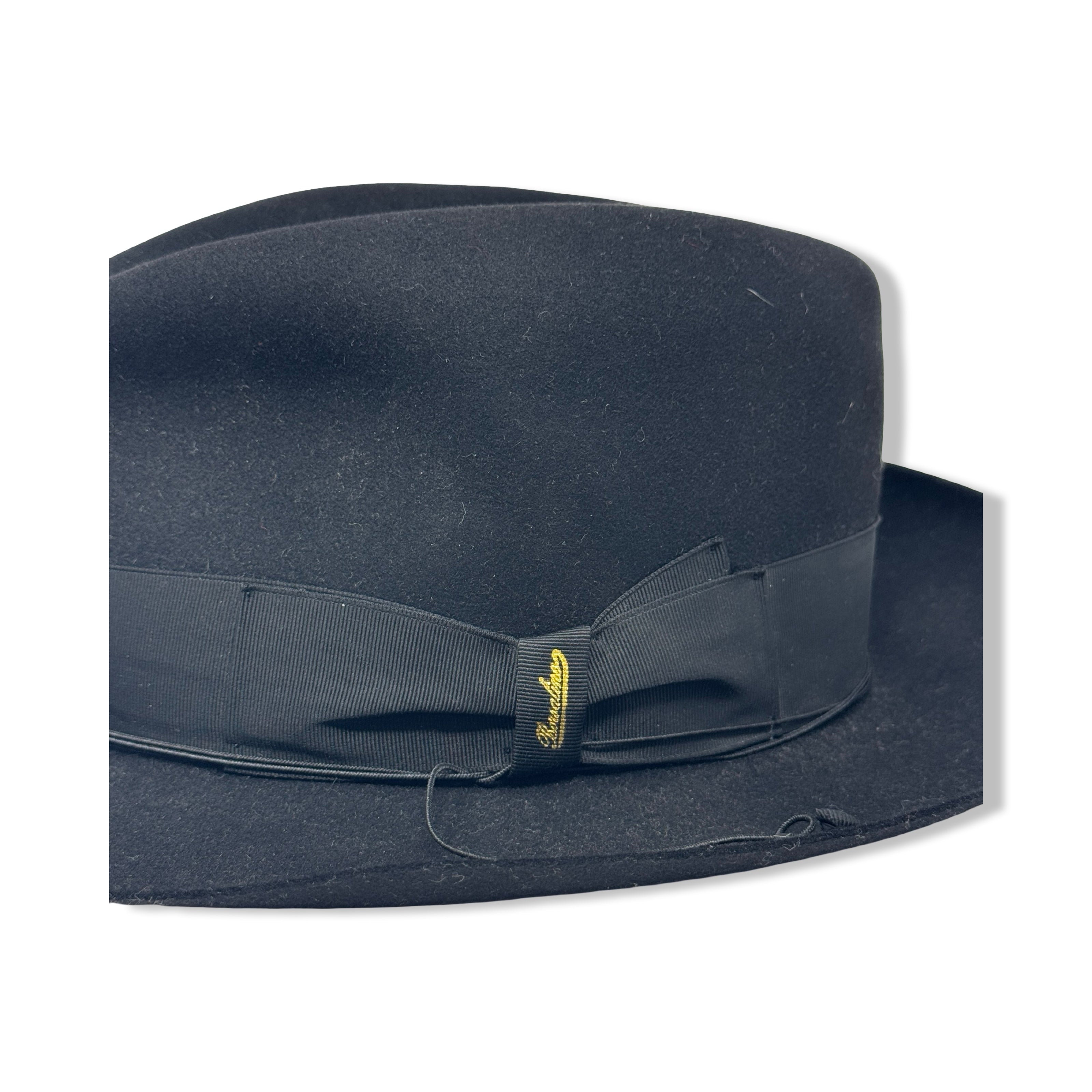 - Fur felt hat with slight curved brim and ribbon around crown. Labeled size 7 3/8