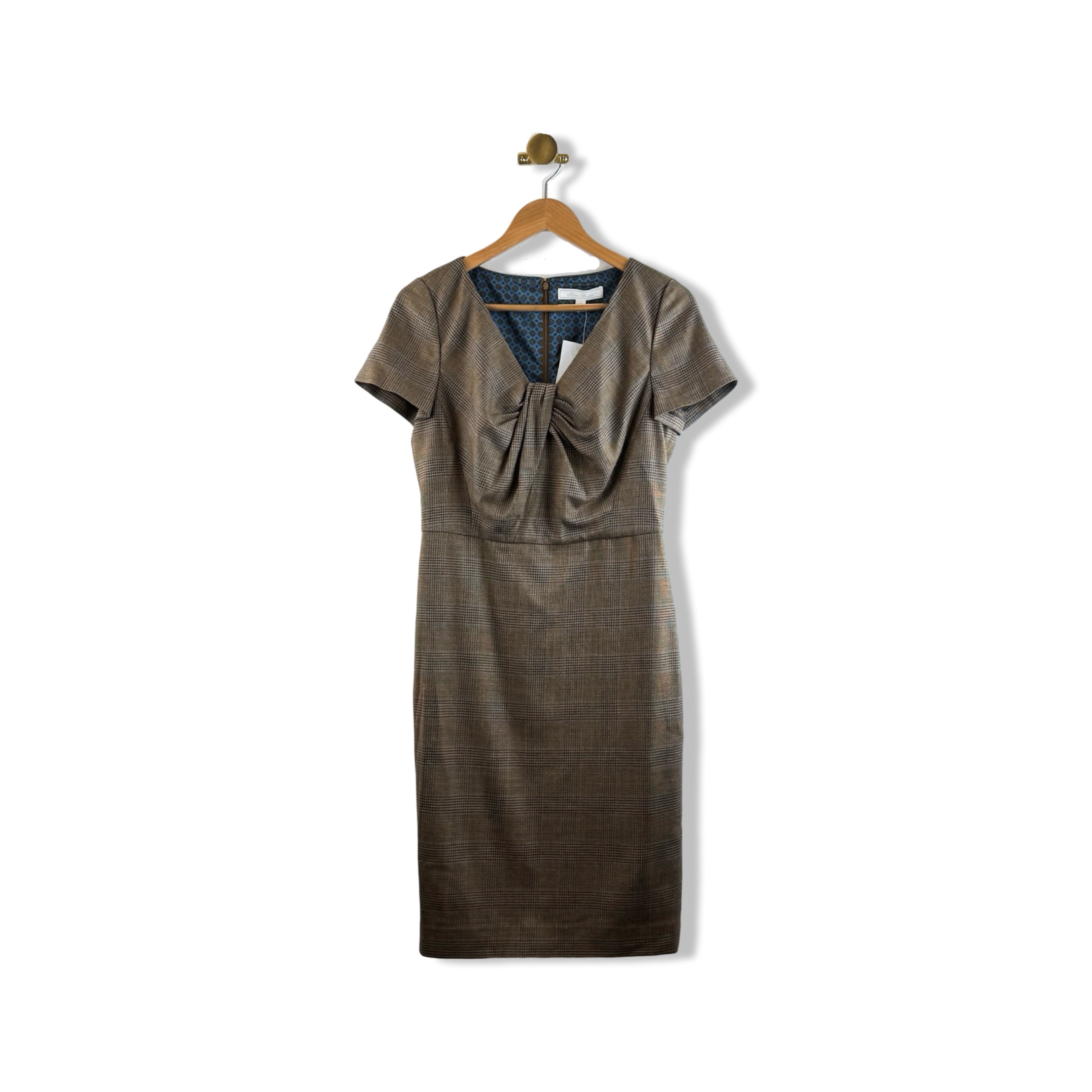 - Short sleeve plaid dress gathered plunge neck and back zip closure