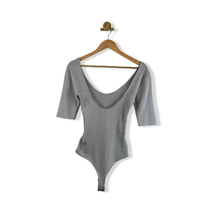 - Bodysuit with metallic thread details and bottom snap button closure
