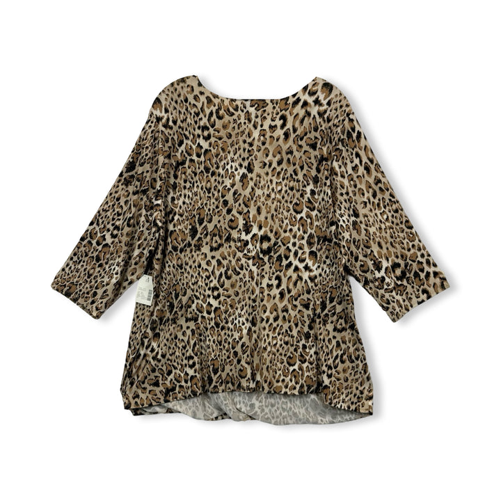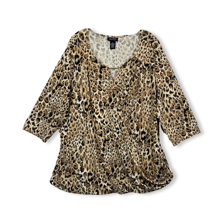 - Quarter sleeve top with keyhole front and faux wrap detail. Labeled size 18/20 or 1X-Large