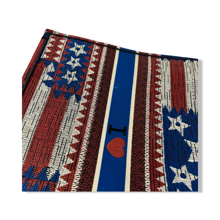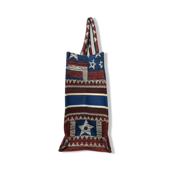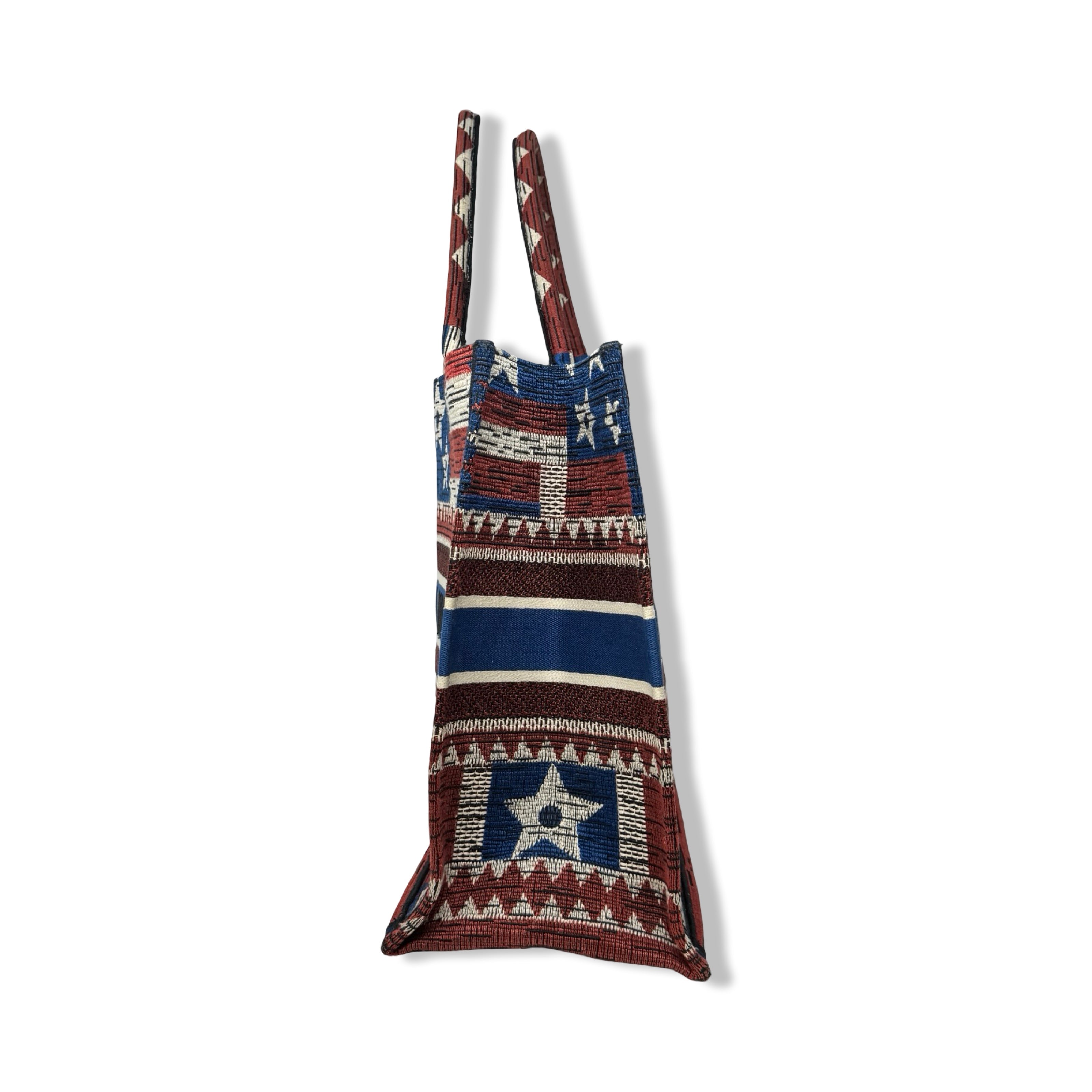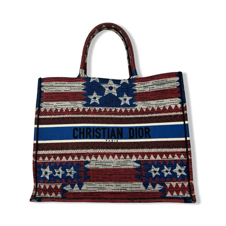 - Canvas tote bag features canvas rolled top handles, American Flag embroidery, Christian Dior logo across the front, and an open interior. Designer dust bag included. Some signs of wear (pictured).