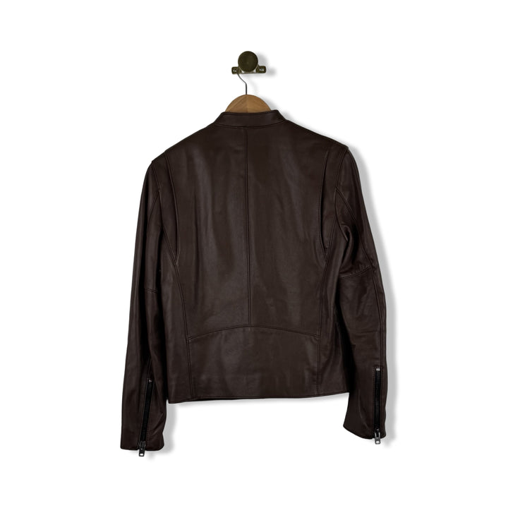 - Zip up leather jacket with front pockets and snap closure on neckline and seam stitch detailing