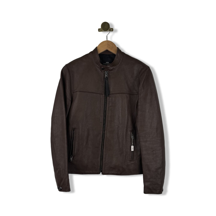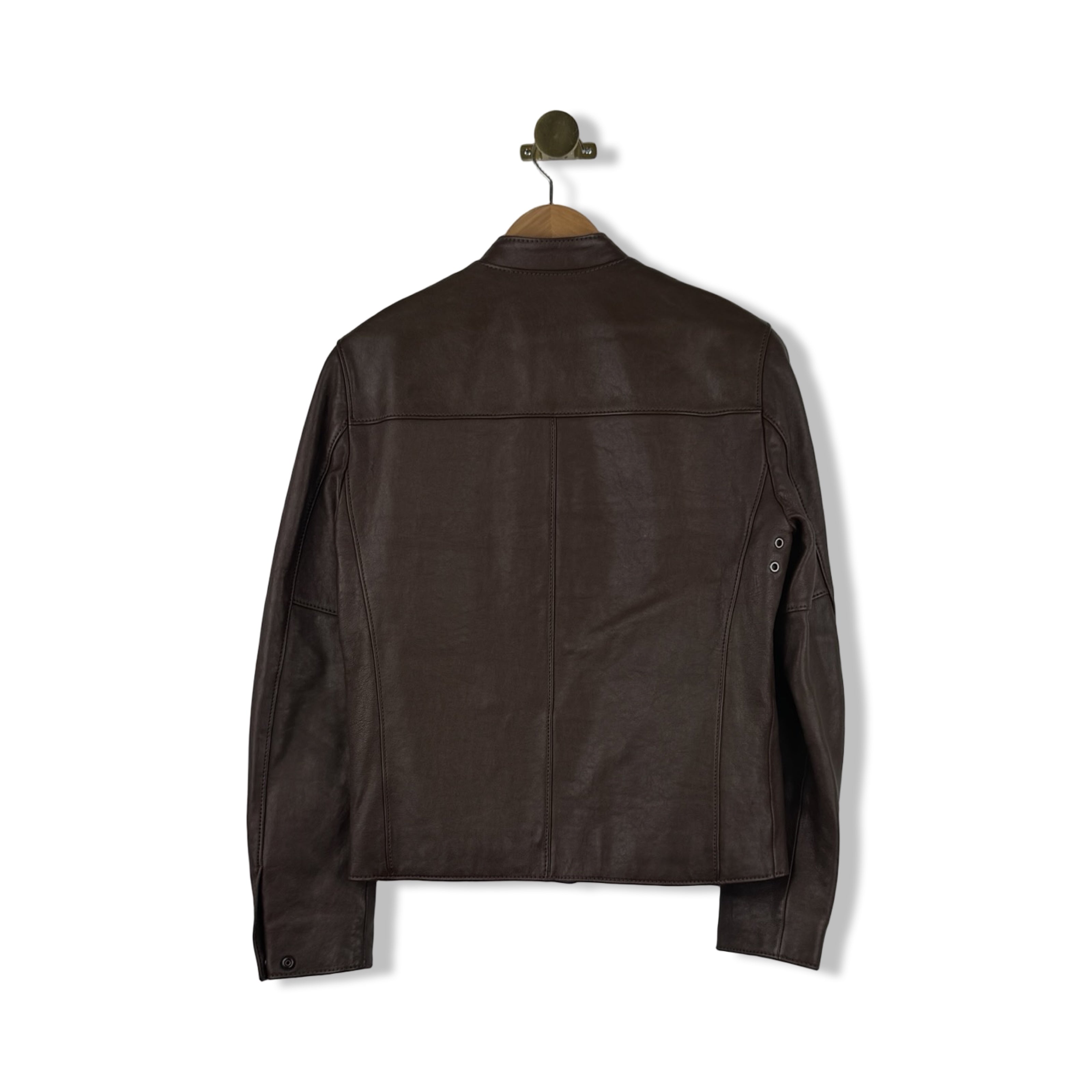 - Zip up leather jacket with front pockets and snap closure on neckline