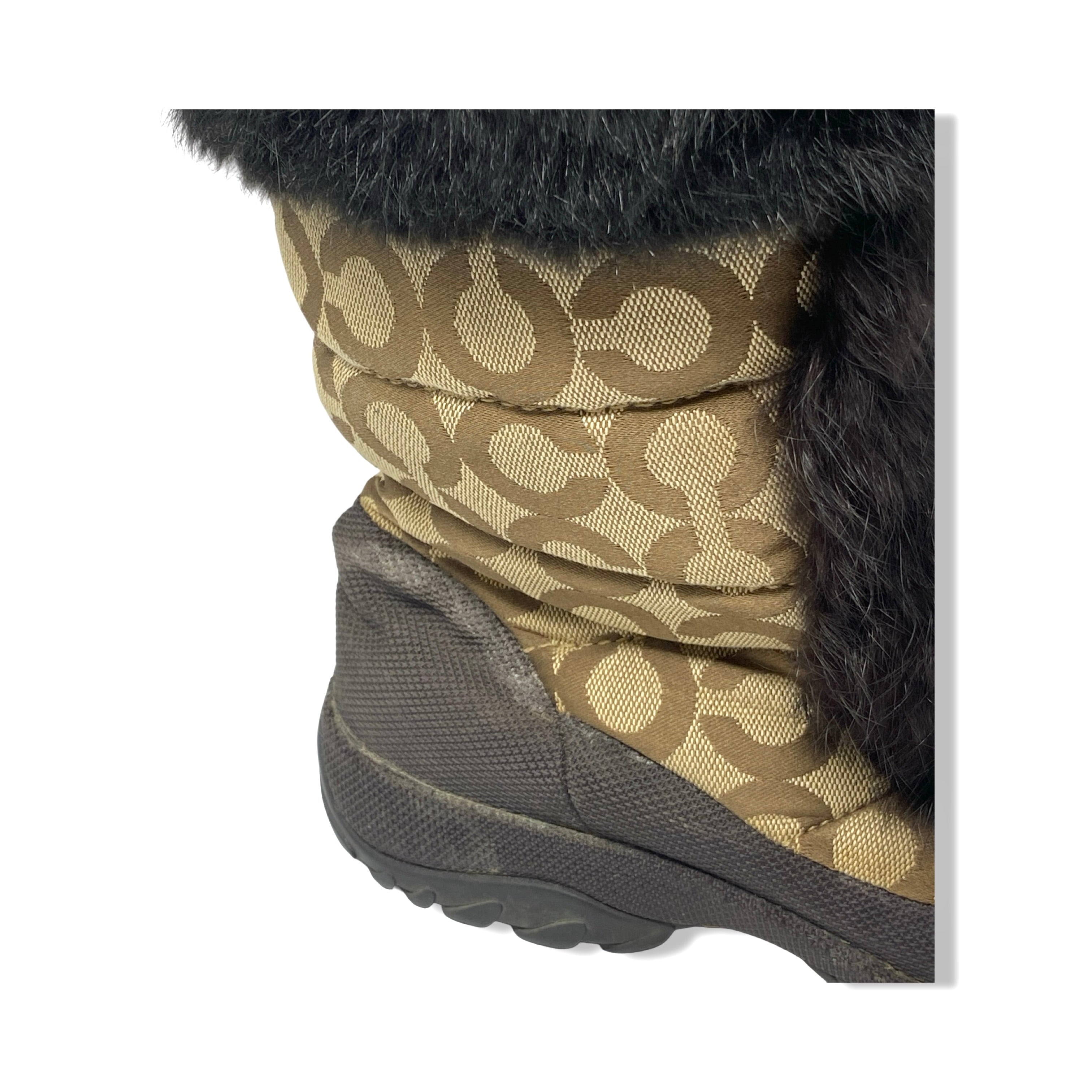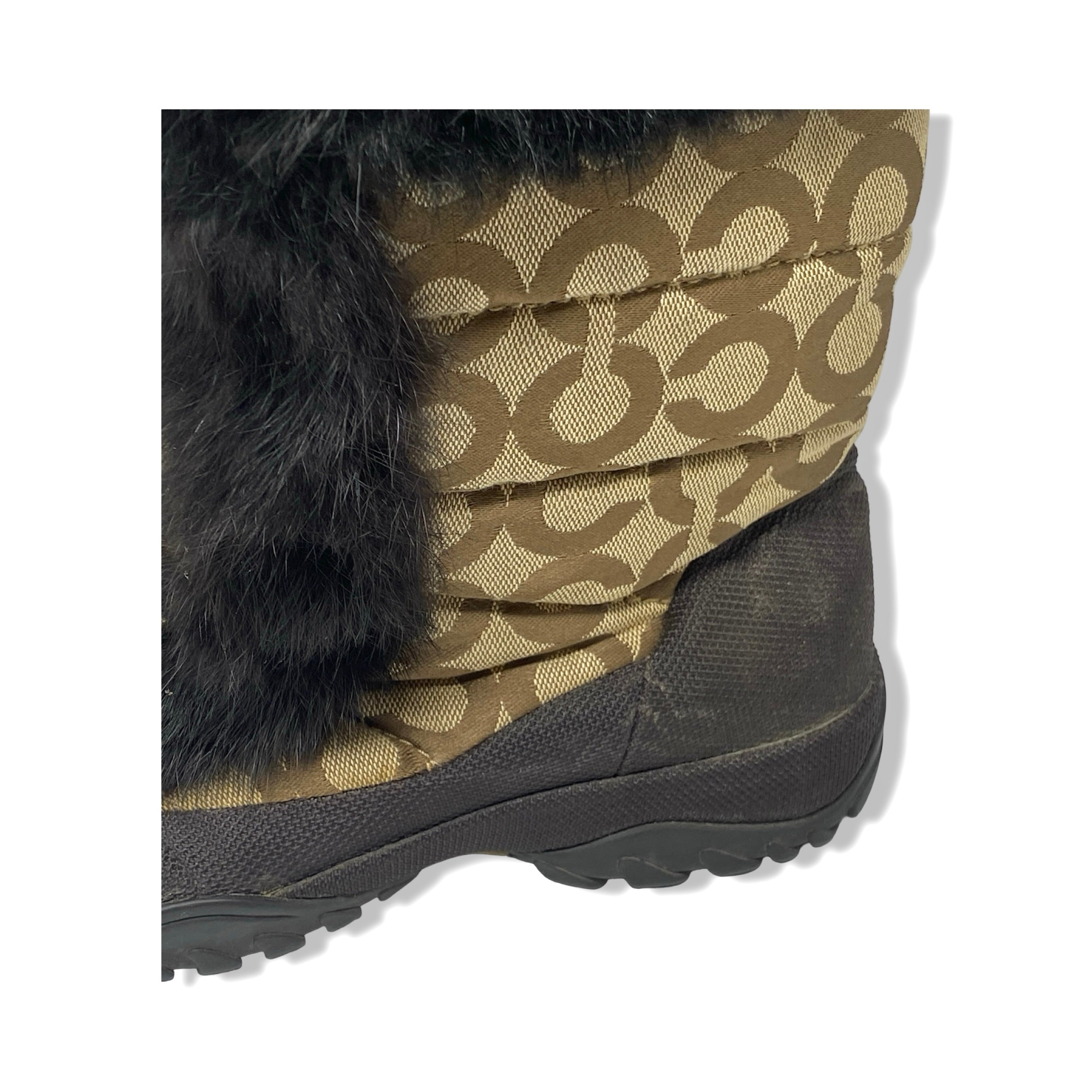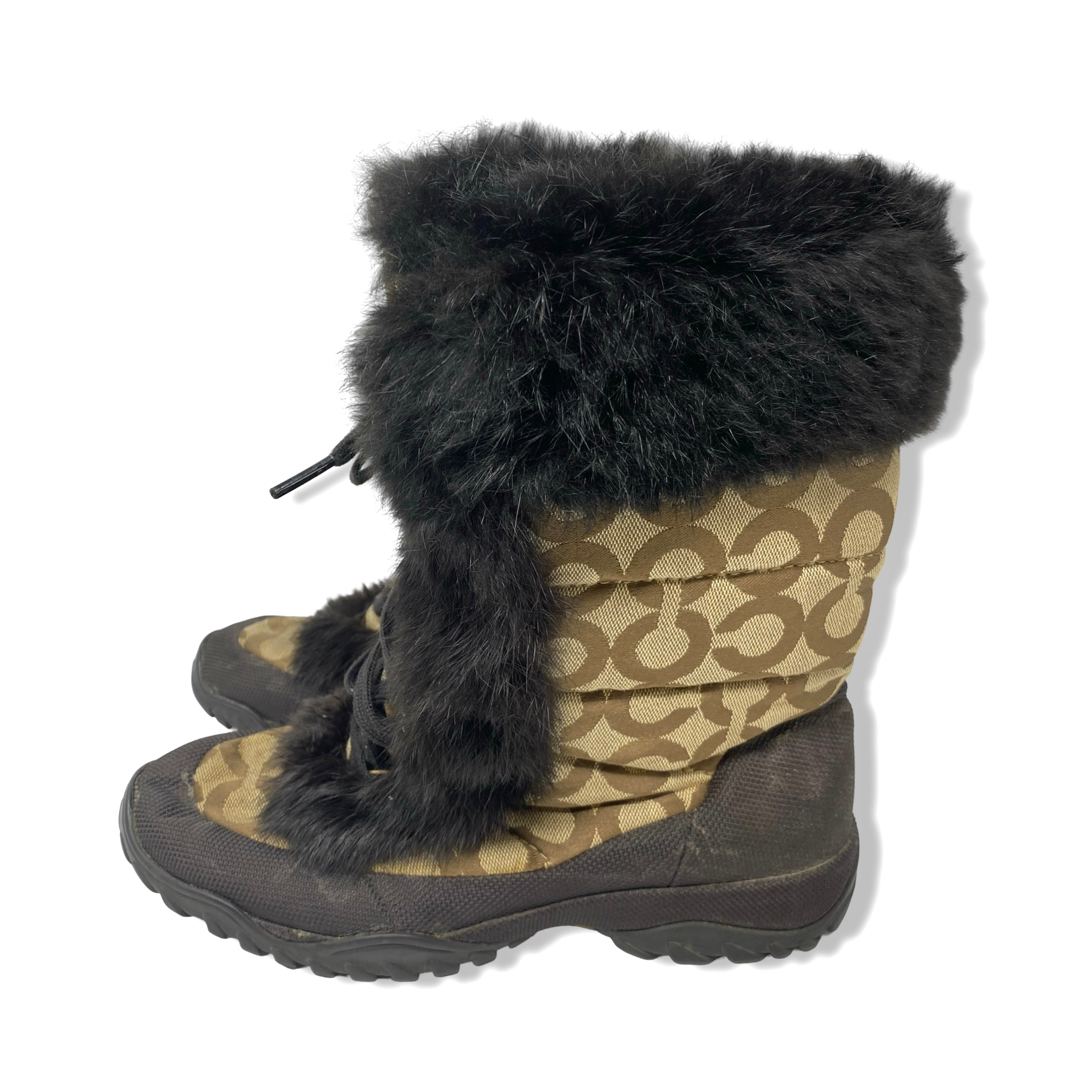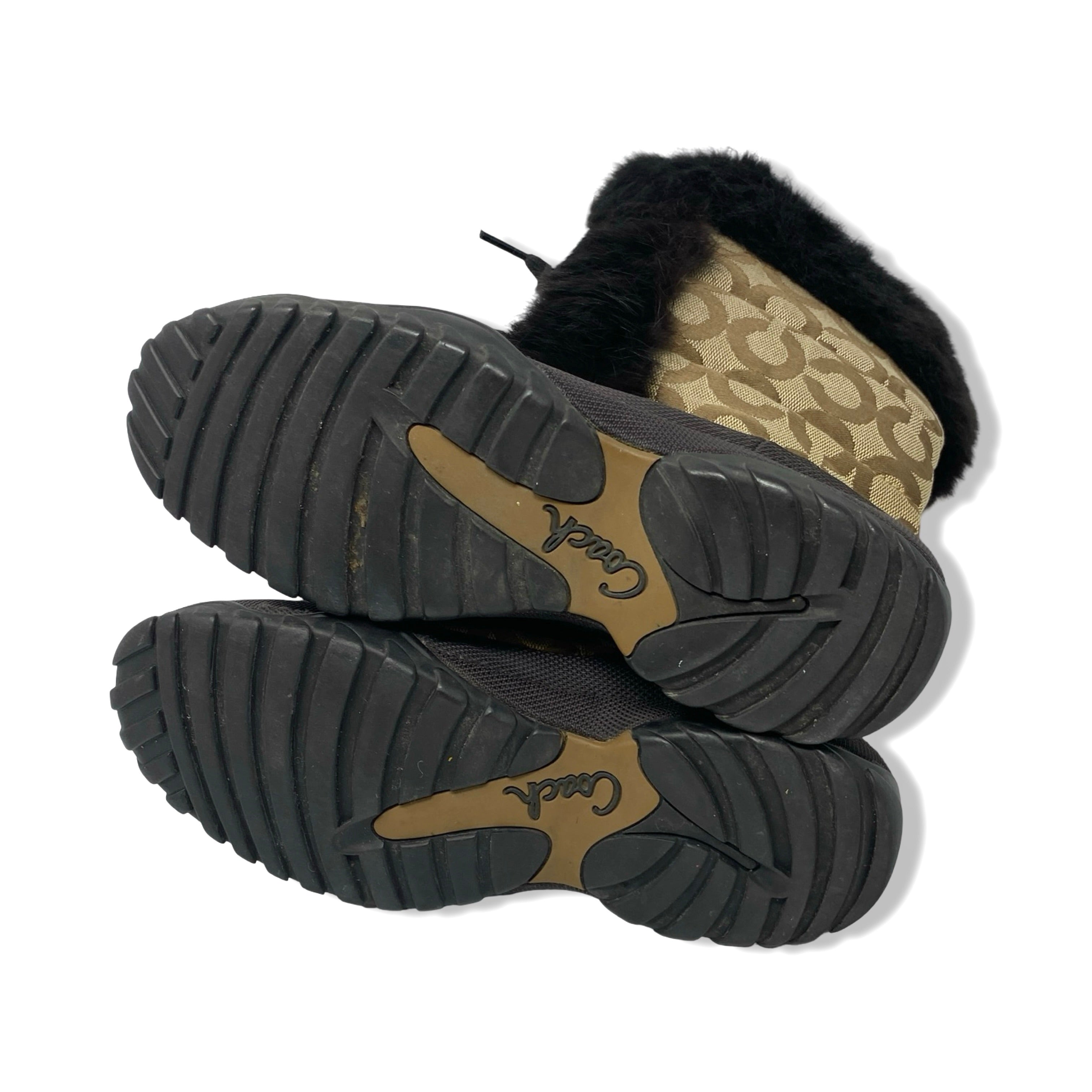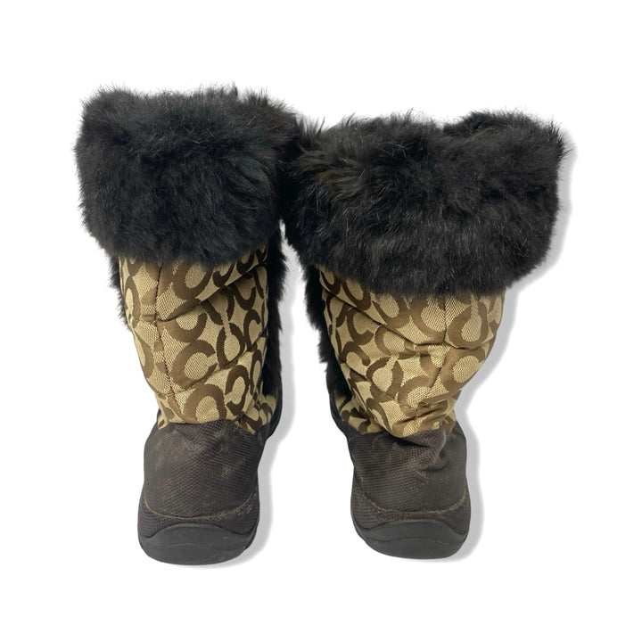 - Lace up quilted boots with fur trim detail and monogram print throughout. Signs of heavy wear throughout
