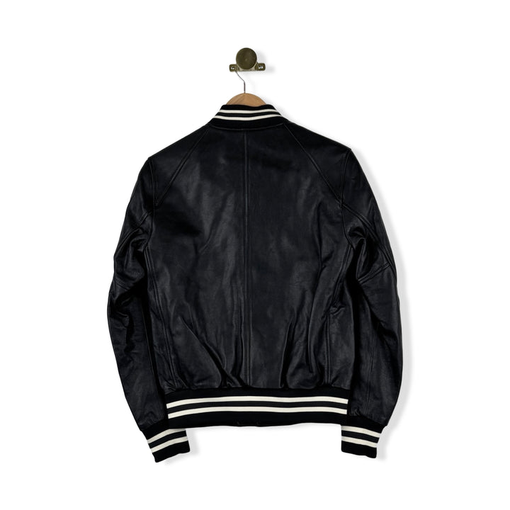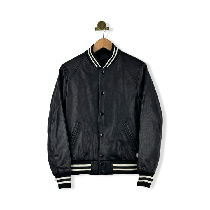 - Varsity style bomber jacket with snap buttons and dual front pockets