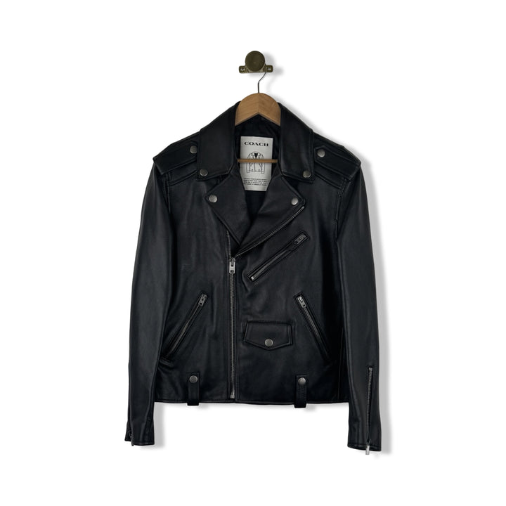 - Pebbled leather jacket with asymmetrical zip closure, front pockets and silver hardware.