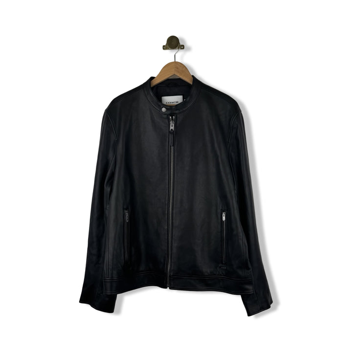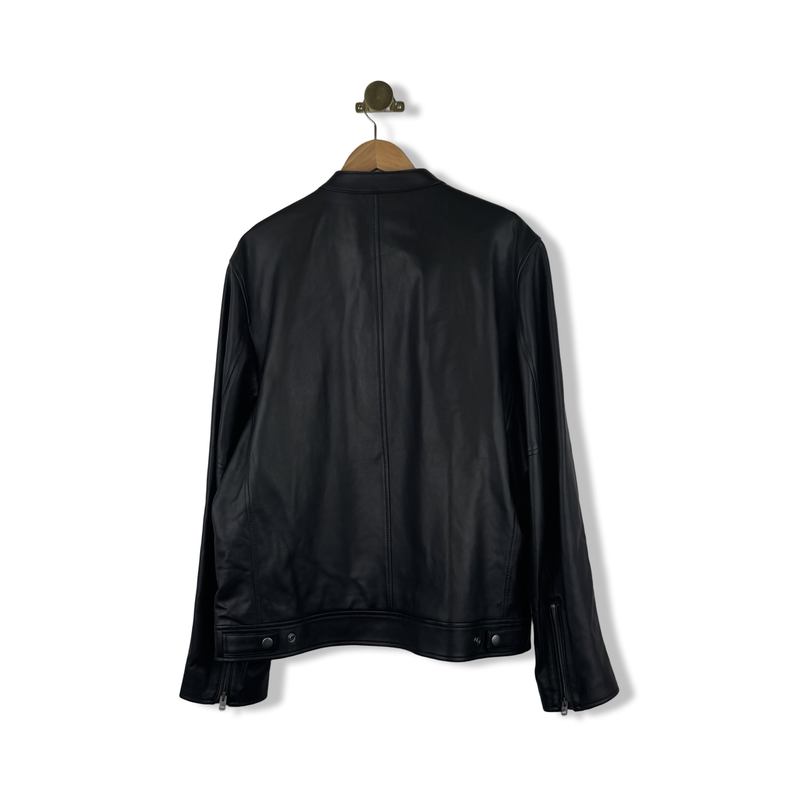 - Zip up leather jacket with front pockets and snap closure on neckline