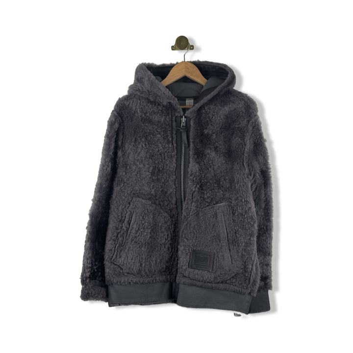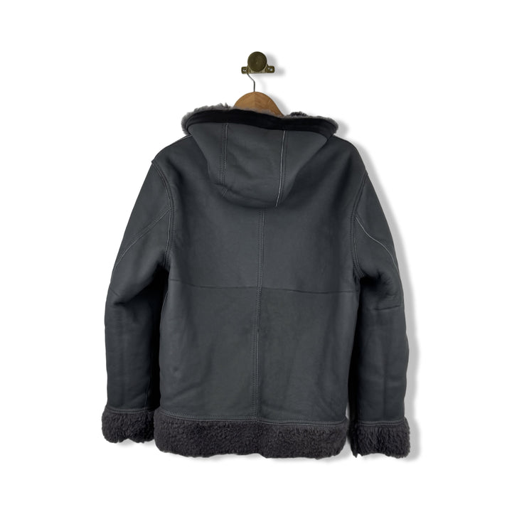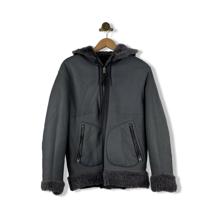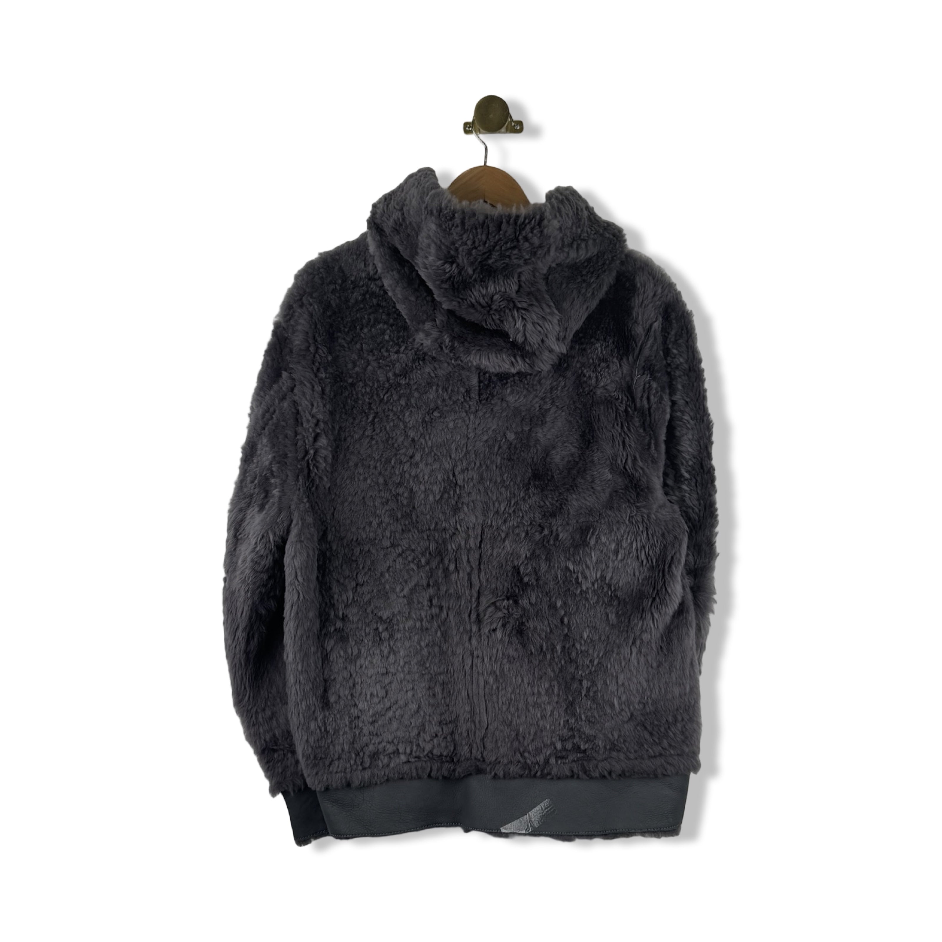 - Zip up hoodie featuring a buttery nappa finish on one side and reverses to plush shearling on the other. The versatile, zip-front style is finished with contrasting leather trim and rib knit cuffs and hem.