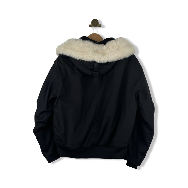 - Zip up parka jacket with snap closure buttons, front pockets, and rib knit panels on hem. Detachable hoodie with adjustable drawstrings and shearling lining.