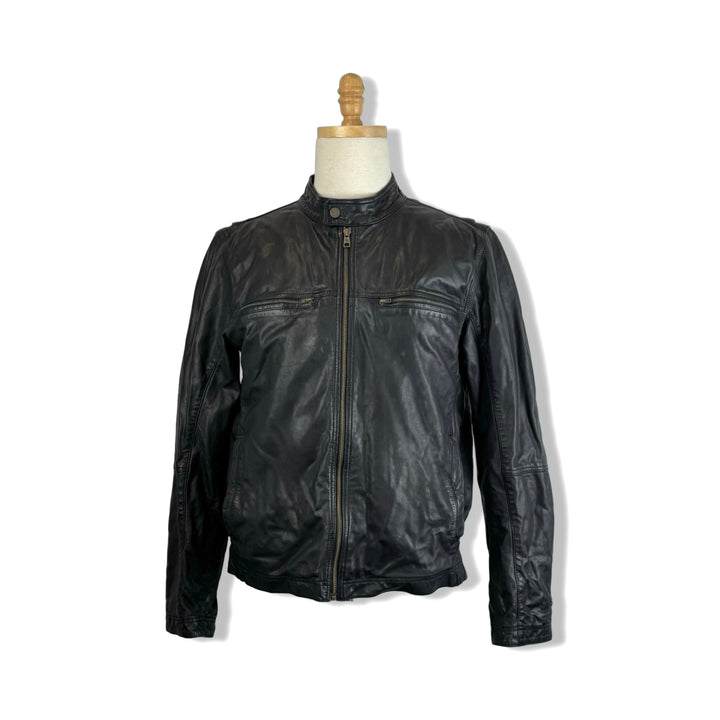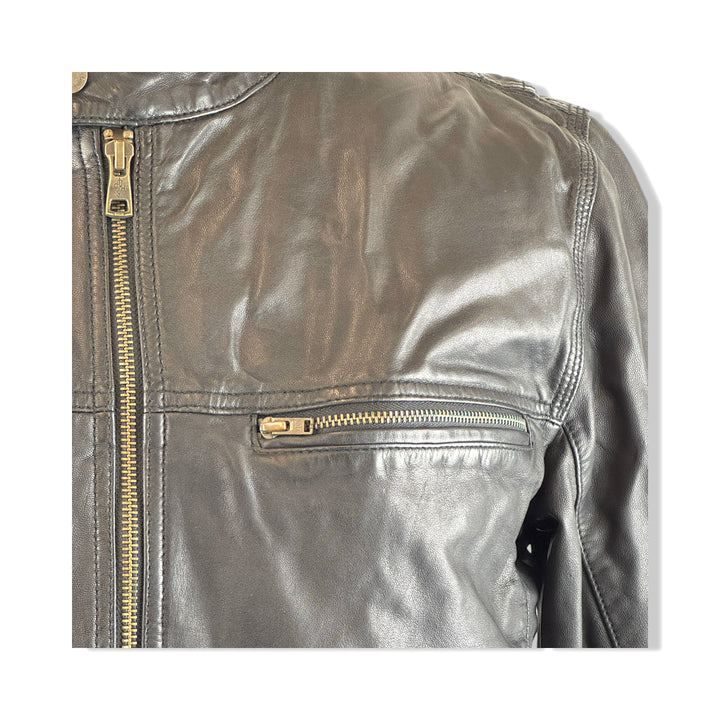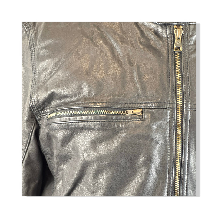- Zip up leather jacket with front pockets and seam stitch detail.