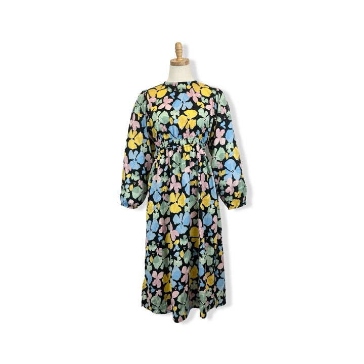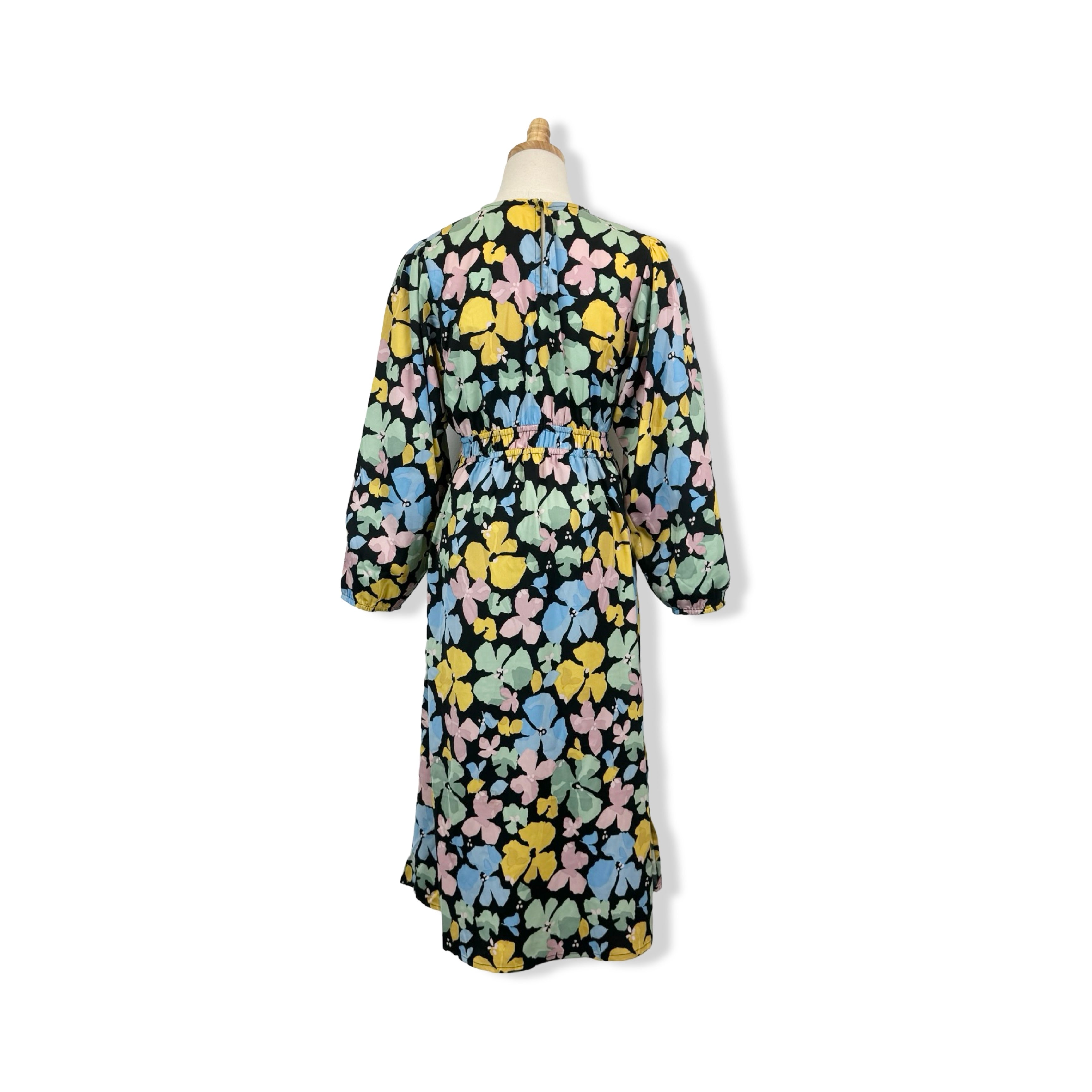 - Retro 80s mid length floral secretary dress with double elastic waistband