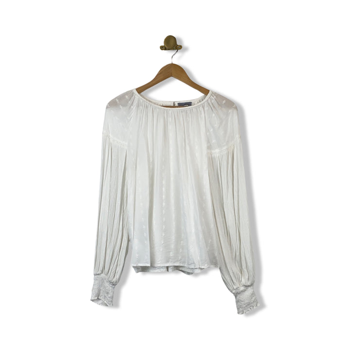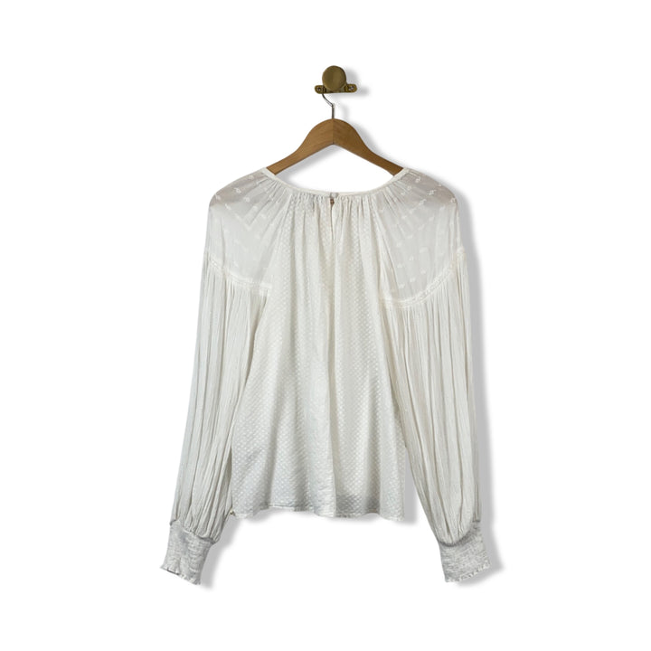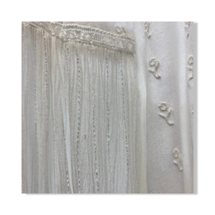 - Embroidered peasant blouse with metallic thread at sleeves and neckline