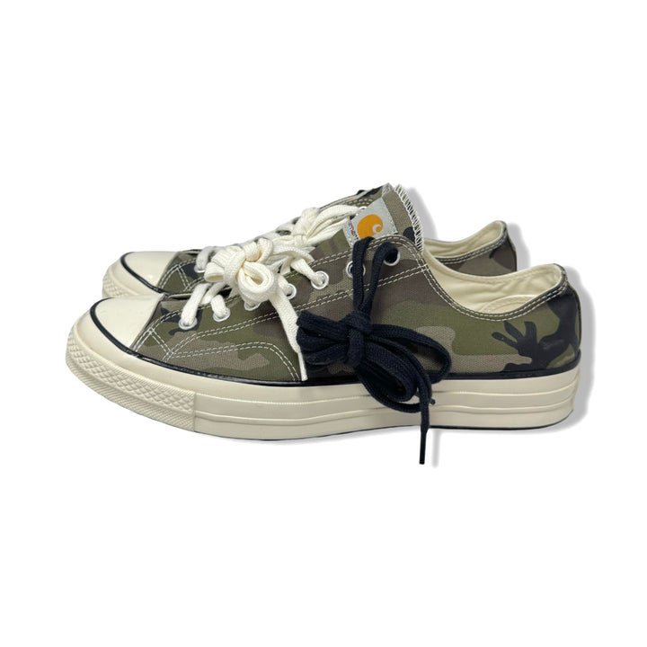 - Lace up classic sneakers feature a traditional woodland camo motif that is applied to the upper, crafted from 12oz organic canvas and embellished with contrast stitching throughout. A Converse All Star patch decorates the medial ankle, while a woven tongue tag displays Carhartt WIP branding.