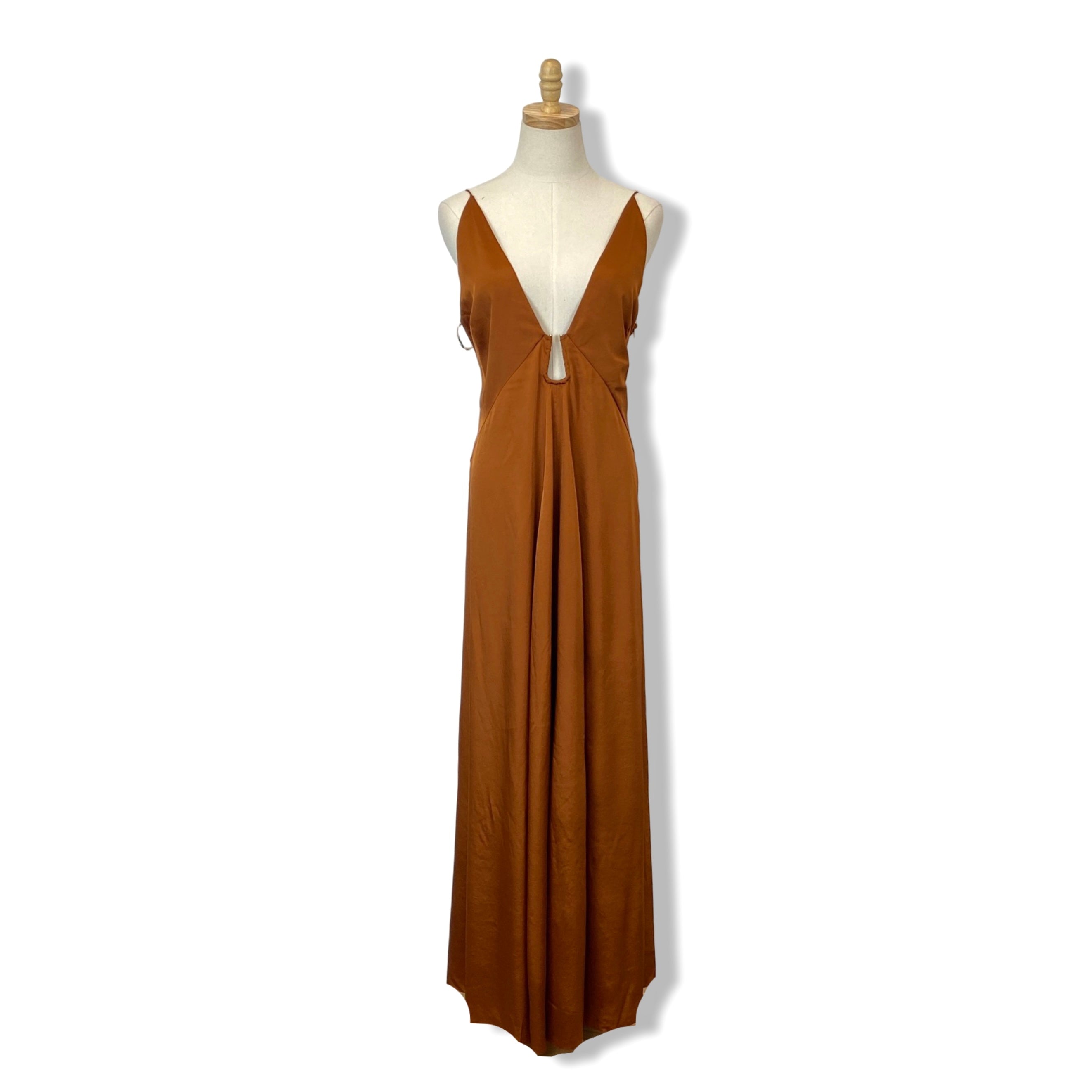 - The ATELIER maxi dress is a true talking-point piece, whether you wear it to special events or beachside dinners in sun-drenched locales. It's shaped for a subtle A-line silhouette and has a plunging V-neckline that dips to a U-shaped cutout, revealing just a hint of midriff. You'll see that it's just as striking from the back, with elegant cowl draping and a supportive band to which the adjustable straps are tied.