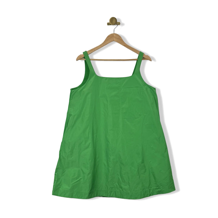 - This A-line mini dress is made from stretch-cotton with a satin front panel and jersey back. It has a curved square neck, side seam pockets, slim shoulder straps and a practical chest patch pocket.