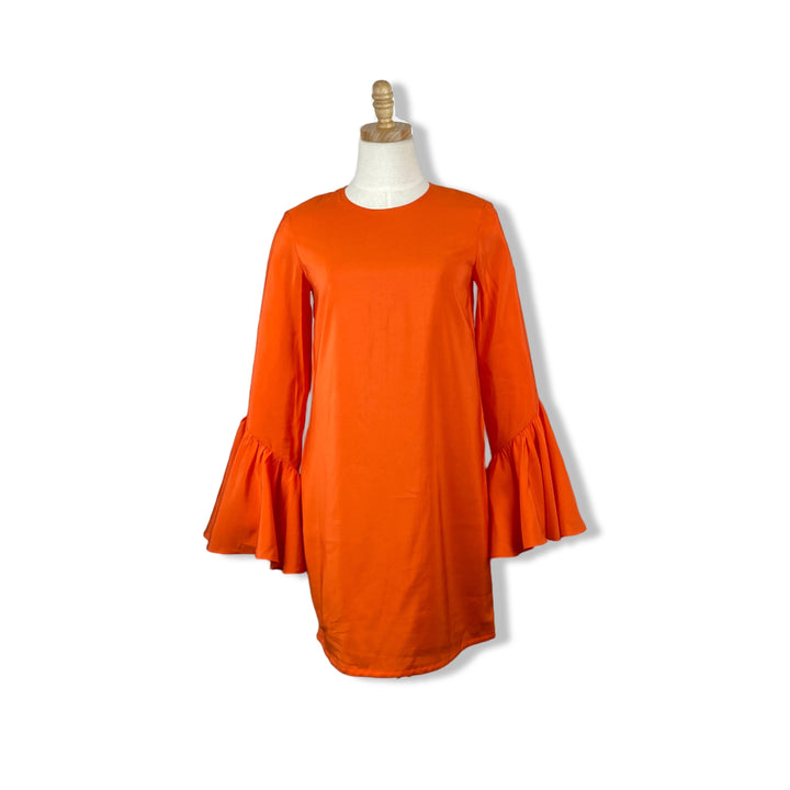 - Straight fit dress with zip closure on back, side seam pockets and flounce sleeves.