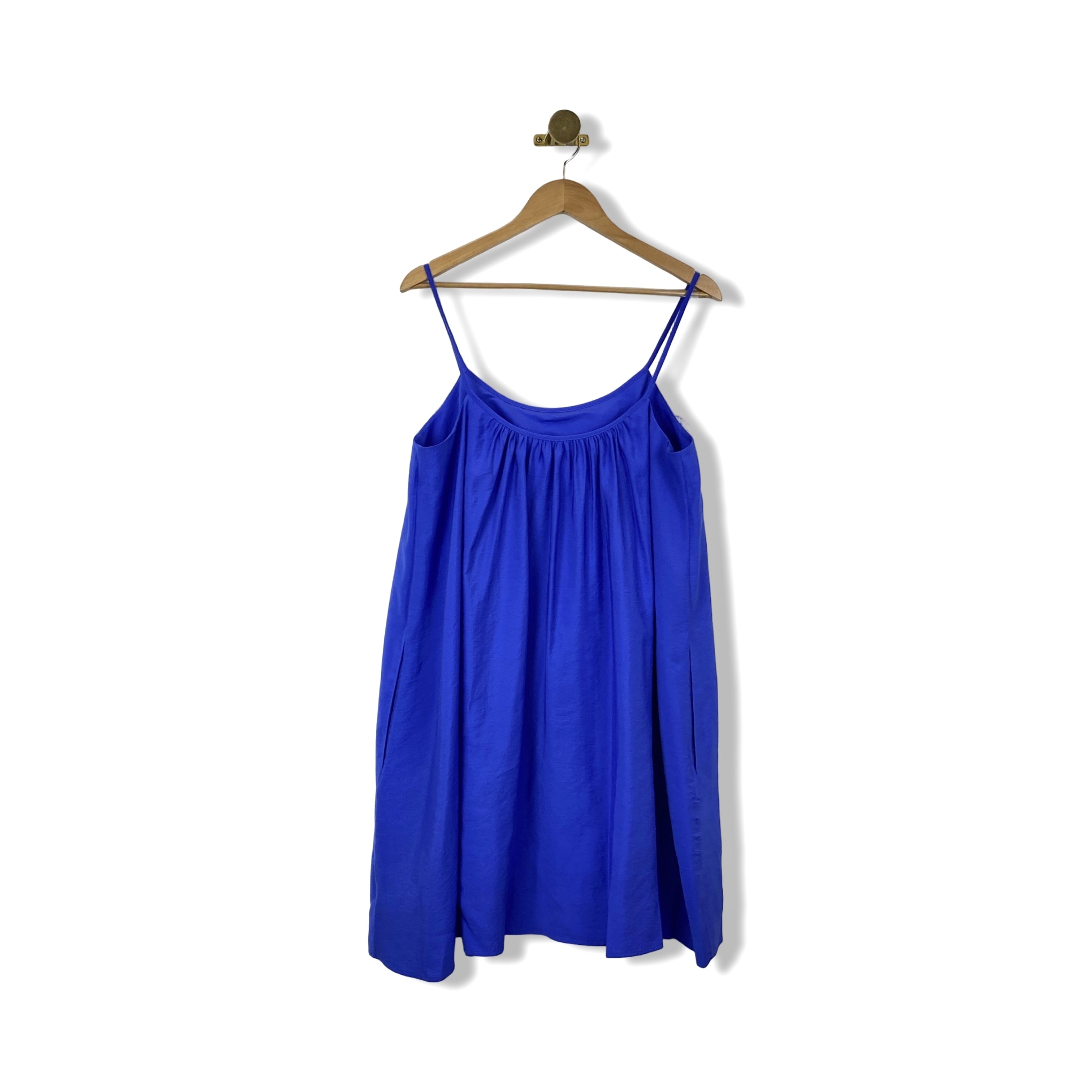 - Easy and effortless, this cobalt-blue mini dress features slender shoulder straps, side-seam pockets and a scooped neckline that's gathered to create a relaxed, draped silhouette.