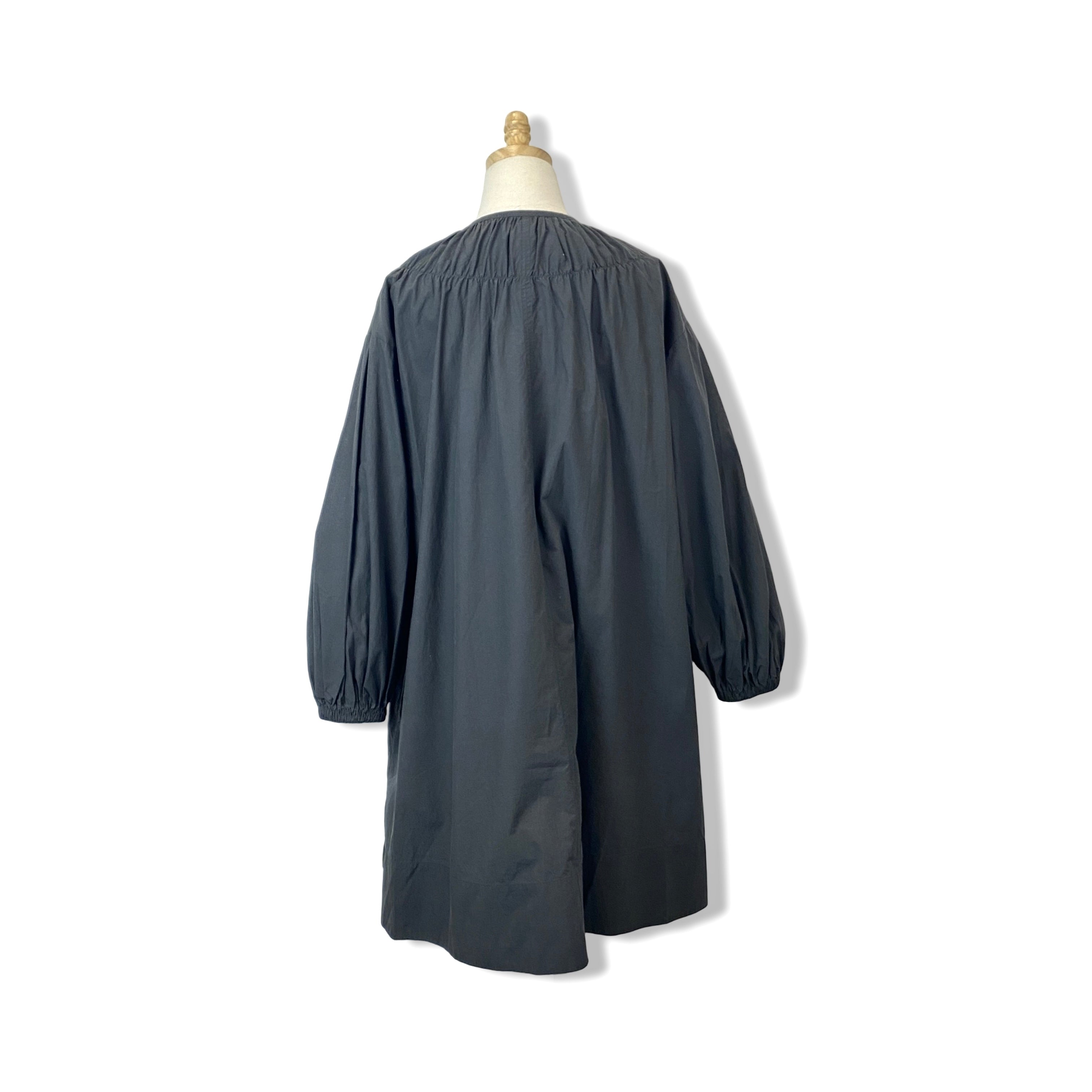 - This oversized mini dress features a round neck with button closure and gathered front panel for a delicate finish. This mini dress also includes side seam pockets and side slits on hem. The voluminous cuffed sleeves create an exaggerated silhouette.