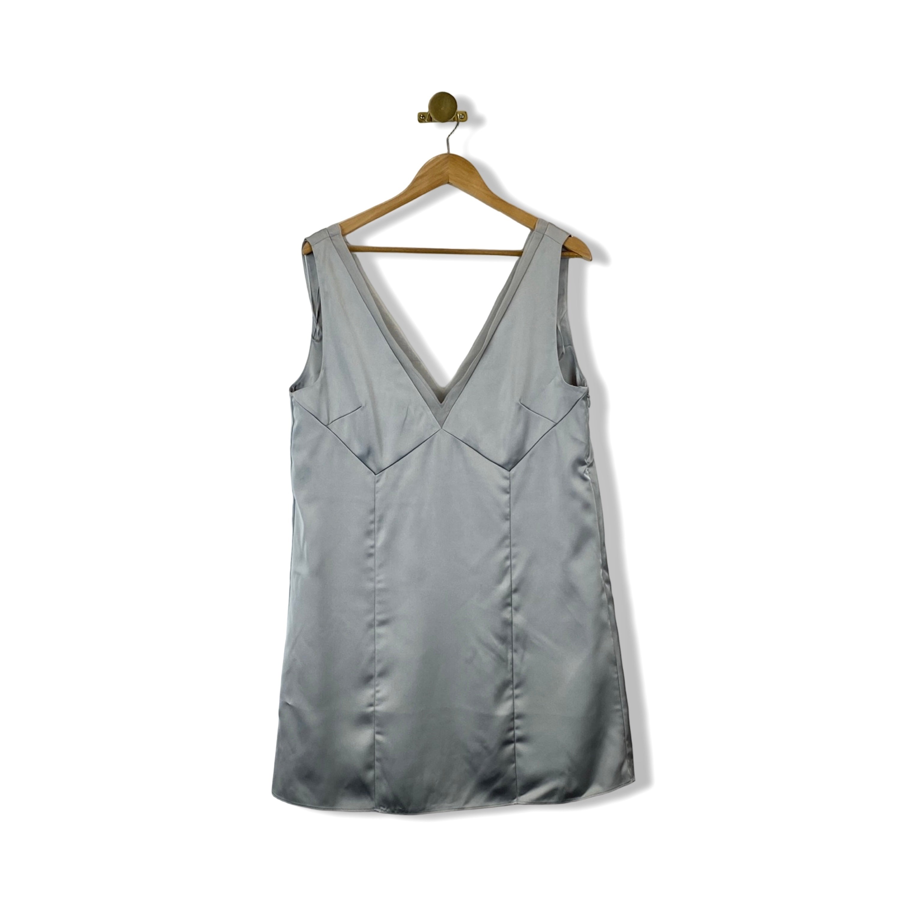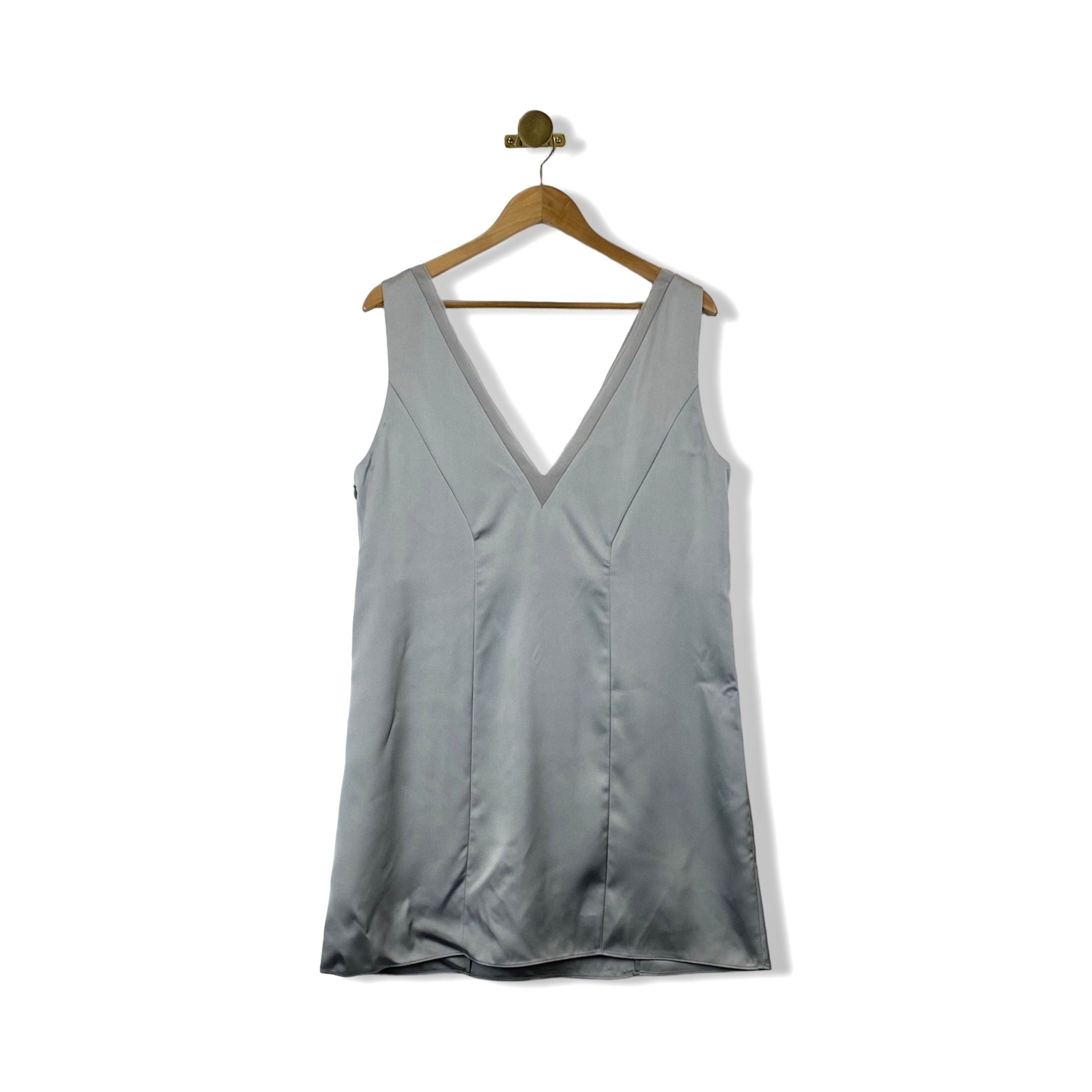 - Offered in a pewter hue that's key for the season, this satin slip dress is shaped with structured panels and crafted from recycled satin underpinned with voile at the V-neckline and back. Slim fit silhouette with a concealed zip closure. Wear it with silver jewelry and mules.